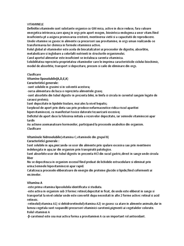 prin aport exogen, biosinteza endogena a unor [Link] insuficienta pt a asigura promovarea cresterii, mentinerea vietii si a capacitatii de reproducere. Unele vitamine se gasesc in alimente ca precursori sau provitamine, in orgs uman realizandu-se transformarea lor chimica in formele vitaminice active. Rolul global al vitaminelor este acela de biocatalizatori ai proceselor de digestie, absorbtie, metabolizare si inglobare a celorlalti nutrienti in structurile organismului. Cand aportul alimentar este insuficient se instaleaza carenta vitaminica. Solubilitatea reprezinta proprietatea vitaminelor care le imprima caracteristicile ciclului biochimic, modul de absorbtie, transport si depozitare, precum si caile de eliminare din orgs. Clasificare Vitamine liposolubile(A,D,E,K) Caracteristici generale: -sunt solubile in grasimi si in solventii acestora; -sursa alimentara de baza o reprezinta alimentele grase; -sunt absorbite din tubul digestiv in prezenta bilei, in limfa si circula in curentul sanguin legate de carausi proteici; Sunt depozitate in lipidele tisulare, mai ales la nivel hepatic; Surplusul de aport prin dieta sau prin produse nefarmaceutice ridica riscul aparitiei hipervitaminozei, cu manifestari toxice datorate tezaurizarii excesive; Deficitul de aport duce la folosirea initiala a rezervelor depozitate, iar semnele vitaminozei apar tardiv Au actiune asemanatoare hormonilor, participand la procesele anabolice din organism. Clasificare Vitaminele hidrosolubile(vitamina C,vitaminele din grupul B) Caracteristici generale : Sunt solubile in apa,pierzandu-se usor din alimente prin spalare excesiva sau prin mentinere indelungata in apa,iar din organism prin transpiratii patologice. Sunt absorbite usor din tubul digestiv in prezenta HCl din sucul gastric,direct in sange unde circula liber Nu se depoziteaza in organism excesul fiind preluat de lichidele extracelulare si eliminat prin [Link] hipovitaminozei apar rapid. Catalizeaza procesele eliberatoare de energie din proteine glucide si lipide,fiind cofermenti ai enzimelor. Vitamina A -este prima vitamina liposolubila identificata si studiata. -este activa in organism sub 3 forme: retinol,depozitat in ficat, de unde este eliberat in sange si transportat la nivel celular unde este convertit dupa necesitati in alte 2 forme active: retinal si acid retinoic. -retinolul(vitamina A1) si dehidroretinolul(vitamina A2) se gasesc ca atare in alimente animale,dar in lumea vegetala sunt raspanditi precursori vitaminici-carotenii,pigmenti ai vegetalelor colorate. Rolul vitaminei A --carotenul este cea mai activa forma a provitaminei A cu un important rol antioxidant.