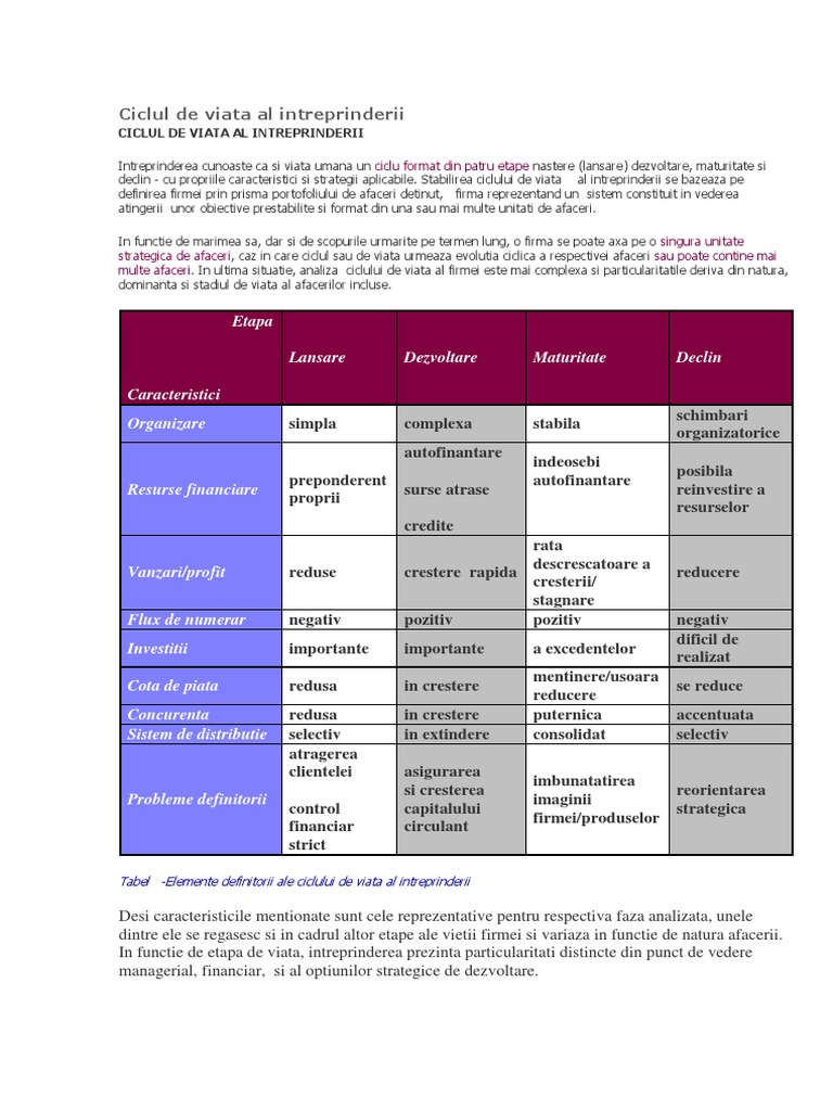 Tabel -Elemente definitorii ale ciclului de viata al intreprinderii