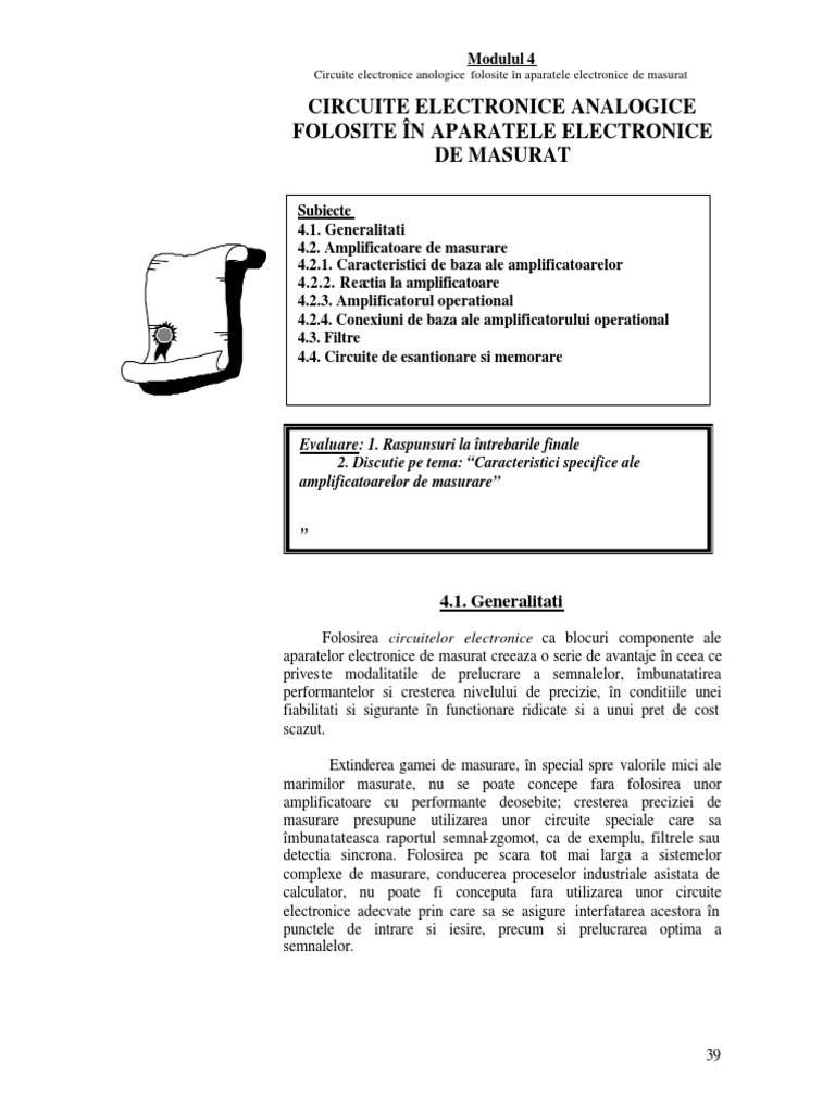 Folosirea circuitelor electronice ca blocuri componente ale aparatelor electronice de masurat creeaza o serie de avantaje n ceea ce prives te modalitatile de prelucrare a semnalelor, mbunatatirea performantelor si cresterea nivelului de precizie, n conditiile unei fiabilitati si sigurante n functionare ridicate si a unui pret de cost scazut. Extinderea gamei de masurare, n special spre valorile mici ale marimilor masurate, nu se poate concepe fara folosirea unor amplificatoare cu performante deosebite; cresterea preciziei de masurare presupune utilizarea unor circuite speciale care sa mbunatateasca raportul semnal- zgomot, ca de exemplu, filtrele sau detectia sincrona. Folosirea pe scara tot mai larga a sistemelor complexe de masurare, conducerea proceselor industriale asistata de calculator, nu poate fi conceputa fara utilizarea unor circuite electronice adecvate prin care sa se asigure interfatarea acestora n punctele de intrare si iesire, precum si prelucrarea optima a semnalelor.