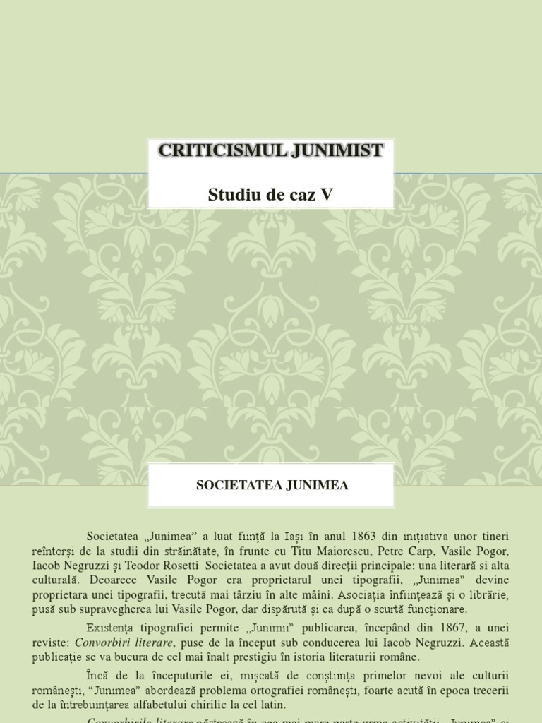 S-a nscut intr-o familie de intelectuali ardeleni, printre multe altele a fost membru fondator al Academiei Romne. El a fost baza Junimismului politic i ,,piatra de fundament pe care s-au construit operele lui Mihai Eminescu, Ion Creang, [Link] i Ioan Slavici. Maiorescu are o contribuie decisiv la modernizarea nvmntului, att in privina temelor i a ideilor cat i in privina metodelor didactice. Este mentorul societii ,,Junimea, iniiaz in 1863 ciclul de ,,preleciuni populare. Dup intrarea junimitilor in politic, in 1874, este numit ministru al Instruciunii Publice, fapt ce-l oblig s se mute la Bucureti.