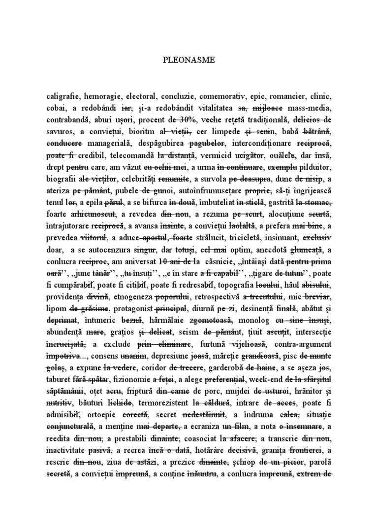 caligrafie, hemoragie, electoral, concluzie, comemorativ, epic, romancier, clinic, cobai, a redobndi iar, i-a redobndit vitalitatea sa, mijloace mass-media, contraband, aburi uori, procent de 30%, veche reet tradiional, delicios de savuros, a convieui, bioritm al vieii, cer limpede i senin, bab btrn, conducere managerial, despgubirea pagubelor, intercondiionare reciproc, poate fi credibil, telecomand la distan, vermicid ucigtor, oulele, dar ns, drept pentru care, am vzut cu ochii mei, a urma n continuare, exemplu pilduitor, biografii ale vieilor, celebriti renumite, a survola pe deasupra, dune de nisip, a ateriza pe pmnt, pubele de gunoi, autonfrumuseare proprie, s-i ngrijeasc tenul lor, a epila prul, a se bifurca n dou, mbuteliat n sticl, gastrit la stomac, foarte arhicunoscut, a revedea din nou, a rezuma pe scurt, alocuiune scurt, ntrajutorare reciproc, a avansa nainte, a convieui laolalt, a prefera mai bine, a prevedea viitorul, a aduce aportul, foarte strlucit, triciclet, insinuant, exclusiv doar, a se autocenzura singur, dar totui, cel mai optim, anecdot glumea, a conlucra reciproc, am aniversat 10 ani de la csnicie, ,,ntiai dat pentru prima oar, ,,june tnr, ,,tu nsui, ,,e n stare a fi capabil, ,,igare de tutun, poate fi cumprabil, poate fi citibil, poate fi redresabil, topografia locului, hul abisului, providena divin, etnogeneza poporului, retrospectiv a trecutului, mic breviar, lipom de grsime, protagonist principal, diurn pe zi, desinen final, abtut i deprimat, ntuneric bezn, hrmlaie zgomotoas, monolog cu sine nsui, abunden mare, graios i delicat, seism de pmnt, iuit ascuit, intersecie ncruciat, a exclude prin eliminare, furtun vijelioas, contra-argument mpotriva..., consens unanim, depresiune joas, mreie grandioas, pisc de munte gola, a expune la vedere, coridor de trecere, garderob de haine, a se aeza jos, taburet fr sptar, fizionomie a feei, a alege preferenial, week-end de la sfritul sptmnii, oet acru, friptur din carne de porc, mujdei de usturoi, hrnitor i nutritiv, buturi lichide, termorezistent la cldur, intrare de acces, poate fi admisibil, ortoepie corect, secret nedestinuit, a ndruma calea, situaie conjunctural, a menine mai departe, a ecraniza un film, a nota o nsemnare, a reedita din nou, a prestabili dinainte, coasociat la afacere, a transcrie din nou, inactivitate pasiv, a recrea nc o dat, hotrre decisiv, grania frontierei, a rescrie din nou, ziua de astzi, a prezice dinainte, chiop de un picior, parol secret, a convieui mpreun, a conine nuntru, a conlucra mpreun, extrem de
