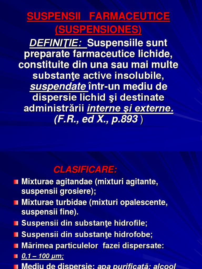 substane active insolubile, suspendate ntr-un mediu de dispersie lichid i destinate administrrii interne i externe. (F.R., ed X., p.893 )