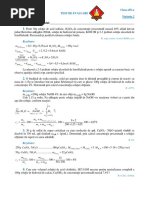 33. * Masa de sare care trebuie dizolvat n 200 g saramur de conc. 25% pentru a obine o sol. de conc. 50% este: a) 50g; b) 25g; c) 30g; d) 10g; e) 100g. 34. * Se poate obine o soluie de dou ori mai concentrat dect cea de la care se pornete dac: a) se dubleaz masa apei; b) se evapor jumtate din masa apei; c)se evapor o cantitate de ap egal cu jumtate din masa soluiei; d) se adaug o cantitate de substan egal cu cea din soluia iniial; e) nici un rspuns corect. 35.* Pentru a obine o soluie de concentraie 63,93% se dilueaz 200 ml soluie de acid sulfuric (= 1,72g/cm3) cu o cantitate de ap egal cu cea existent n soluia iniial. Concentraia procentual a soluiei supus dilurii este: a) 65%; b) 70,45%; c) 80,2%; d) 78%; e) 74%. 36* Dac se toarn jumtate de litru de ap (= 1g/cm3) peste 400 g soluie de concentraie 35% se obine o soluie de concentraie: a) 11,11%; b) 23%; c) 15,55%; d) 18,88%; e) 30%. 37.* O soluie pierde prin evaporare jumtate din ap. tiind c n soluia rmas dup evaporare masa dizolvat reprezint un sfert din masa apei rmase, atunci concentraia procentual este: a) 25% pentru soluia rmas dup evaporare; b) 11,11% pentru soluia iniial ; c) 12,5% pentru soluia iniial; d) 30,77% pentru soluia rmas dup evaporare; e) 20% pentru soluia iniial. 38. a) Calculeaz concentraiile molare ale soluiilor rezultate prin dizolvarea n ap a cantitilor de substane indicate mai jos, tiind c soluiile rezultate au volumele: Nr. Substana dizolvat Cantitatea n grame Volumul soluiei rezultate n ml 1 AgNO3 1,70 250 . 2 CuSO4 5H2O 24,97 100 b) Calculeaz cantitatea n grame de substan dizolvat conform precizrilor din tabel: Nr. Soluia Substana dizolvat 1 150 ml sol. AgNO3 0,5 M AgNO3=?g 2 500 ml BaCl2 0,1M BaCl2 .2H2O = ?g Rezolvare: 1. Vs 150ml 0,15l md CM M Vs C M = 0,5 M md C M M Vs ; md = ? g md 0,5 170 0,15 m d = 12,75 g AgNO 3 c) Calculeaz volumul soluiei de HCl de concentraie 2M necesar preparrii a 100 ml soluie de concentraie 0,8M. 39. Determin formula cristalohidratului de CoCl 2 care conine 44,84% ap. 40. Afl concentraia molar a unei soluii ce conine: a) 8 g Na OH n 500 cm3 soluie; b) 0,6 g NaOH n 400 cm3soluie; c) 25 g AgNO3 n 1l soluie; d) 20 g NH4 NO3 n 200ml soluie. 41. Ci moli de NaCl se gsesc n 25 ml de soluie de NaCl 0,15M? 42. ntr-o reacie sunt necesari 0,05 moli de HCl i ai la dispoziie o soluie de HCl 2M. Cum trebuie procedat? 43. Ce concentraie molar are soluia de H2SO4 17% (=1,12g/cm3)?