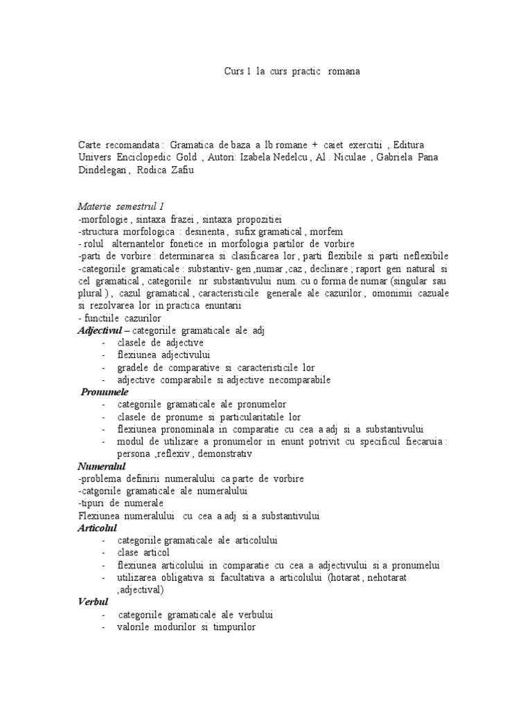 Carte recomandata : Gramatica de baza a lb romane + caiet exercitii , Editura Univers Enciclopedic Gold , Autori: Izabela Nedelcu , Al . Niculae , Gabriela Pana Dindelegan , Rodica Zafiu Materie semestrul 1 -morfologie , sintaxa frazei , sintaxa propozitiei -structura morfologica : desinenta , sufix gramatical , morfem - rolul alternantelor fonetice in morfologia partilor de vorbire -parti de vorbire : determinarea si clasificarea lor , parti flexibile si parti neflexibile -categoriile gramaticale : substantiv- gen ,numar ,caz , declinare ; raport gen natural si cel gramatical , categoriile nr substantivului num. cu o forma de numar (singular sau plural ) , cazul gramatical , caracteristicile generale ale cazurilor , omonimii cazuale si rezolvarea lor in practica enuntarii - functiile cazurilor Adjectivul categoriile gramaticale ale adj - clasele de adjective - flexiunea adjectivului - gradele de comparative si caracteristicile lor - adjective comparabile si adjective necomparabile Pronumele - categoriile gramaticale ale pronumelor - clasele de pronume si particularitatile lor - flexiunea pronominala in comparatie cu cea a adj si a substantivului - modul de utilizare a pronumelor in enunt potrivit cu specificul fiecaruia : persona ,reflexiv , demonstrativ Numeralul -problema definirii numeralului ca parte de vorbire -catgoriile gramaticale ale numeralului -tipuri de numerale Flexiunea numeralului cu cea a adj si a substantivului Articolul - categoriile gramaticale ale articolului - clase articol - flexiunea articolului in comparatie cu cea a adjectivului si a pronumelui - utilizarea obligativa si facultativa a articolului (hotarat , nehotarat ,adjectival) Verbul - categoriile gramaticale ale verbului - valorile modurilor si timpurilor