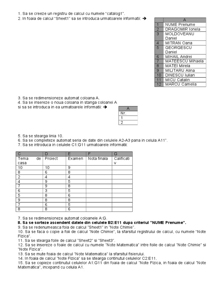 7. Sa se redimensioneze automat coloanele A:G. 8. Sa se sorteze ascendent datele din celulele B2:E11 dupa criteriul NUME Prenume. 9. Sa se redenumeasca foia de calcul Sheet1 in Note Chimie. 10. Sa se faca o copie a foii de calcul Note Chimie, la sfarsitul registrului de calcul, cu numele Note Fizica. 11. Sa se stearga foile de calcul Sheet2 si Sheet3. 12. Sa se insereze o foaie de calcul cu numele Note Matematica intre foile de calcul Note Chimie si Note Fizica. 13. Sa se mute foaia de calcul Note Matematica la sfarsitul fisierului. 14. In foaia de calcul Note Fizica sa se stearga continutul celulelor C2:E11. 15. Sa se copieze continutul celulelor A1:G11 din foaia de calcul Note Fizica, in foaia de calcul Note Matematica, incepand cu celula A1.