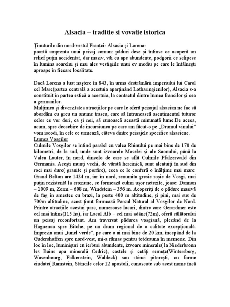 inuturile din nord-vestul Franei- Alsacia i Lorenapoart amprenta unui peisaj comun: pduri dese i ntinse ce acoper un relief puin accidentat, dar masiv, vi cu ape abundente, podgorii ce sclipesc n lumina soarelui i mai ales vestigiile unui ev mediu pe care le ntlneti aproape n fiecare localitate. Dac Lorena a luat natere n 843, n urma destrmrii imperiului lui Carol cel Mare(partea central a acestuia aparinnd Lotharingienilor), Alsacia s-a constituit n partea estic a acestuia, la contactul dintre lumea francilor i cea a germanilor. Mulimea i diversitatea atraciilor pe care le ofer peisajul alsacian ne fac s abordm cu greu un anume traseu, care s ntruneasc asentimentul tuturor celor ce vor dori, ca i noi, s cunoasc aceast minunat [Link] aceea, acum, spre deosebire de incursiunea pe care am fcut-o pe Drumul vinului vom iscodi, n cele ce urmeaz, cteva dintre peisajele specifice alsaciene. Lumea Vosgilor Culmile Vosgilor se ntind paralel cu valea Rhinului pe mai bine de 170 de kilometri, de la sud, unde sunt izvoarele Moselei i ale Saonului, pn la Valea Lauter, n nord, dincolo de care se afl Culmile Pfalzerwald din Germania. Aceti muni vechi, de vrst hercinic, sunt alcatuii n sud din roci mai dure( granite i porfire), ceea ce le confer o nlime mai mare: Grand Belton are 1424 m, iar n nord, renumita gresie roie de Vosgi, mai puin rezistent la eroziune, ce formeaz culmi uor netezite, joase: Dannon 1009 m, Zorm 608 m, Windstein 356 m. Acoperii de o pdure masiv de fag n amestec cu brazi, la peste 400 m altitudine, i pini, mai sus de 700m altitudine, acest inut formeaz Parcul Natural al Vosgilor de Nord. Printre atraciile acestui parc, numeroase lacuri, dintre care Gerardmer este cel mai ntins(115 ha), iar Lacul Alb cel mai adnc(72m), ofer cltorului un peisaj reconfortant. Am traversat pdurea vosgian, plecnd de la Haguenau spre Bitche, pe un drum regional de o calitate excepional. Impresia unui tunel verde, pe care o ai mai bine de 20 km, ncepnd de la Gudershoffen spre nord-vest, mi-a rmas pentru totdeauna n memorie. Din loc n loc, luminiuri cu ierburi abundente, izvoare minerale( la Niederbronn les Bains apa mineral Cedric), castele i ceti semee(Wintersberg, Wasenbourg, Falkenstein, Waldeck) sau stnci pitoreti, cu forme ciudate( Ramstein, Stncile celor 12 apostoli, cunoscute sub acest nume nc