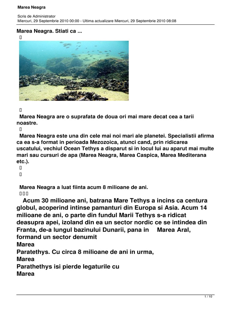 Marea Neagra are o suprafata de doua ori mai mare decat cea a tarii noastre. Marea Neagra este una din cele mai noi mari ale planetei. Specialistii afirma ca ea s-a format in perioada Mezozoica, atunci cand, prin ridicarea uscatului, vechiul Ocean Tethys a disparut si in locul lui au aparut mai multe mari sau cursuri de apa (Marea Neagra, Marea Caspica, Marea Mediterana etc.). Marea Neagra a luat fiinta acum 8 milioane de ani.