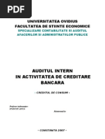 cu att mai puin ctre cea dat de Institutul Francez de Audit (2000) (care restrnge rolul auditului intern la acela de supra-control)6. Regulamentul BNR nr.18/2009 privind cadrul de administrare a activitatii institutiilor de credit, procesul intern de evaluare a adecvarii capitalului la riscuri si conditiile de externalizare a activitatilor acestora, care a nlocuit, ncepnd cu 2011, Norma BNR nr. 17/2003 nu mai conine o definiie a auditului intern, prefernd s fac trimitere la reglementrile Camerei Auditorilor Financiari din Romnia (art. 50, alin.3). Aceste reglementri, aprobate prin Hotararea CAFR nr.88/2007 pentru aprobarea Normelor de audit intern, rein urmtoarea definiie a auditului intern: Auditul intern este o activitate independent i obiectiv care d unei entiti o asigurare n ceea ce privete gradul de control asupra operaiunilor, o ndrum pentru a-i mbunti operaiunile, i contribuie la adugarea unui plus de valoare. Auditul intern ajut aceast organizaie s i ating obiectivele evalund, printr-o abordare sistematic i metodic, procesele sale de management al riscurilor, de control, i de guvernare a organizaiei, i fcnd propuneri pentru a le consolida eficacitatea. Cuvinte cheie Audit Audit intern Audit intern bancar ntrebri 1. Ce este auditul intern bancar? 2. Care este diferena dintre auditul de tip anglo-saxon i cel francofon? Activitatea de audit
