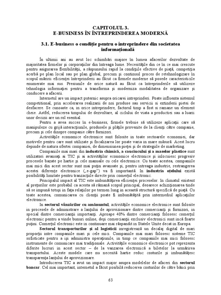 economice electronice pentru o servire mai bun a clienilor, cu scopul crerii unor relaii susinute cu acetia. E Business depete cu mult stadiul tranzaciilor incheiate. TIC pentru managementul informaiei i transparena proceselor. In ciuda tendinelor de concentrare asupra serviciilor oferite clienilor, creterea eficienei proceselor interne rmane un obiectiv important pentru TIC. Studiile de caz arat c un potenial major al TIC in acest context este imbuntirea transparenei proceselor i managementul informaiilor, care faciliteaz procesele de planificare i de luare a deciziilor. Externalizarea i intermediarii electronici. TIC i activitile economice electronice creeaz noi oportuniti pentru externalizarea proceselor economice specifice. Externalizarea promite mrirea productivitii companiei. eIntermediarii specializai susin schimbul de date intre companii. TIC pentru o dezvoltare industrial durabil. Potenialul TIC de a permite companiilor s reduc cantitatea de energie pe care o folosesc sau, cel puin, s creasc eficiena energiei, nu este inc pe deplin ineles. Acest subiect ocup un loc important in agenda intreprinderilor i in cea politic datorit costurilor de energie in cretere i provocrilor legate de mediul inconjurtor. Un efort considerabil va fi depus in promovarea inovrii in acest domeniu, de exemplu prin implementarea unor noi sisteme de administrare a energiei. Implicaiile activitilor economice electronice pentru modelele de afaceri. Dac e-Business 3.0 se ridic la ateptri, este probabil ca multe companii s ii revizuiasc sau s ii schimbe modelele de afaceri in direcia strategiei electronice. Acest lucru include deciziile cu privire la acele pri ale lanului de valori care trebuie s fie acoperite, la portofoliile produselor, la canalele de distribuie, i la strategiile de cooperare. TIC i inovarea devin inseparabile. Noile serii de studii de sector confirm inc o dat rolul esenial al TIC in introducerea noilor procese de afaceri, cum ar fi inovarea organizaional i de proces din companii. Limitele dintre implementarea noilor sisteme bazate pe TIC i introducerea inovrii de proces devin neclare. Diferena dintre inovarea de produs i de proces ar putea deveni caduc, deoarece produsele i serviciile sunt combinate in noi moduri. Activitile economice electronice sunt folosite in toate sectoarele economiei, dar motivele pentru care sunt utilizate i focalizarea lor poate varia in mare msur. Acest lucru depinde de natura ofertei companiei, de dimensiunea pieei i de strategiile de marketing.