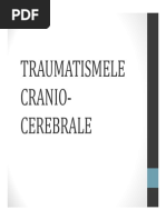 Traumatismul cranio-cerebral presupune suferina creierului produs de un traumatism ce a afectat cutia cranian. Aceast suferin poate fi uoar, de tipul comoiei cerebrale, exprimat printr-o scurt pierdere de contien sau poate fi mai grav, cu substrat lezional de timpul hematoamelor intracraniene, dilacerrii cerebrale, leziunii axonale difuze, suferinei cerebrale secundare, infeciilor meningo-cerebrale sau contuziilor cerebrale. Contuziile cerebrale pot fi: Contuzii directe, atunci cnd ocul este transmis mecanic asupra creierului la nivelul impactului Contuzii prin contralovitur ocul este transmis pe proeminenele osoase sau septurile durale endocraniene Contuzii edematogene provocate de reacii inflamatorii edematogene Contuzii hemoragice cu extravazare sanguin extravascular difuz Dup gravitate exist contuzii grave, medii i minore