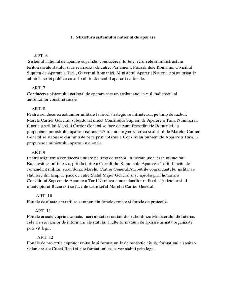 ART. 6 Sistemul national de aparare cuprinde: conducerea, fortele, resursele si infrastructura teritoriala ale statului si se realizeaza de catre: Parlament, Presedintele Romanie, Consiliul Suprem de Aparare a Tarii, Guvernul Romaniei, Ministerul Apararii Nationale si autoritatile administratiei publice cu atributii in domeniul apararii nationale. ART. 7 Conducerea sistemului national de aparare este un atribut exclusiv si inalienabil al autoritatilor constitutionale ART. 8 Pentru conducerea actiunilor militare la nivel strategic se infiinteaza, pe timp de razboi, Marele Cartier General, subordonat direct Consiliului Suprem de Aparare a Tarii. Numirea in functie a sefului Marelui Cartier General se face de catre Presedintele Romaniei, la propunerea ministrului apararii [Link] organizatorica si atributiile Marelui Cartier General se stabilesc din timp de pace prin hotarire a Consiliului Suprem de Aparare a Tarii, la propunerea ministrului apararii nationale. ART. 9 Pentru asigurarea conducerii unitare pe timp de razboi, in fiecare judet si in municipiul Bucuresti se infiinteaza, prin hotarire a Consiliului Suprem de Aparare a Tarii, functia de comandant militar, subordonat Marelui Cartier [Link] comandantului militar se stabilesc din timp de pace de catre Statul Major General si se aproba prin hotarire a Consiliului Suprem de Aparare a [Link] comandantilor militari ai judetelor si al municipiului Bucuresti se face de catre seful Marelui Cartier General. ART. 10 Fortele destinate apararii se compun din fortele armate si fortele de protectie. ART. 11 Fortele armate cuprind armata, mari unitati si unitati din subordinea Ministerului de Interne, cele ale serviciilor de informatii ale statului si alte formatiuni de aparare armata organizate potrivit legii. ART. 12 Fortele de protectie cuprind: unitatile si formatiunile de protectie civila, formatiunile sanitarvoluntare ale Crucii Rosii si alte formatiuni ce se vor stabili prin lege.
