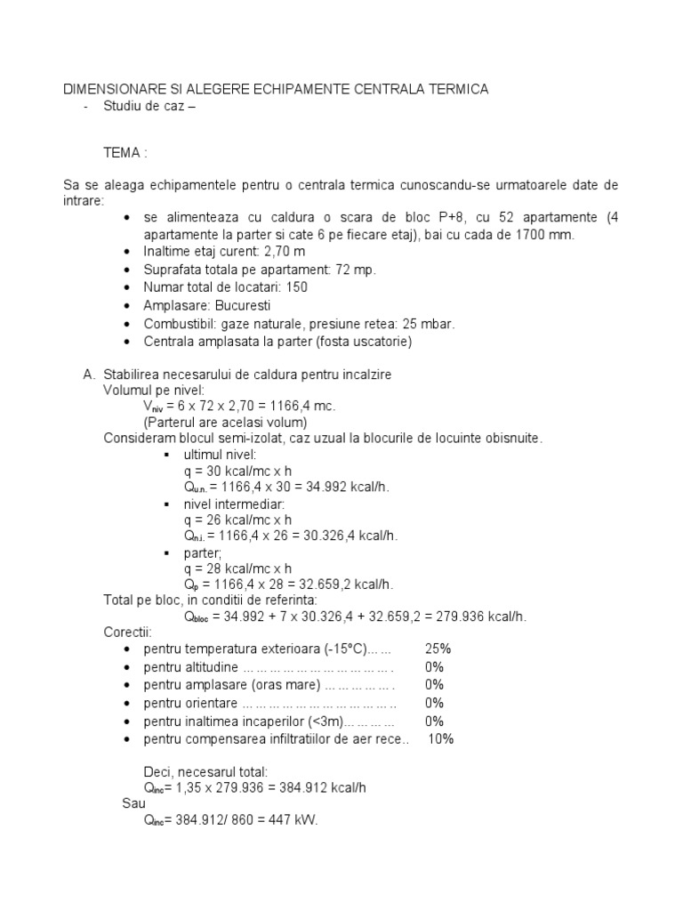 e date de intrare: se alimenteaza cu caldura o scara de bloc P+8, cu 52 apartamente (4 apartamente la parter si cate 6 pe fiecare etaj), bai cu cada de 1700 mm. Inaltime etaj curent: 2,70 m Suprafata totala pe apartament: 72 mp. Numar total de locatari: 150 Amplasare: Bucuresti Combustibil: gaze naturale, presiune retea: 25 mbar. Centrala amplasata la parter (fosta uscatorie) A. Stabilirea necesarului de caldura pentru incalzire Volumul pe nivel: Vniv = 6 x 72 x 2,70 = 1166,4 mc. (Parterul are acelasi volum) Consideram blocul semi-izolat, caz uzual la blocurile de locuinte obisnuite. ultimul nivel: q = 30 kcal/mc x h Qu.n. = 1166,4 x 30 = 34.992 kcal/h. nivel intermediar: q = 26 kcal/mc x h Qn.i. = 1166,4 x 26 = 30.326,4 kcal/h. parter; q = 28 kcal/mc x h Qp = 1166,4 x 28 = 32.659,2 kcal/h. Total pe bloc, in conditii de referinta: Qbloc = 34.992 + 7 x 30.326,4 + 32.659,2 = 279.936 kcal/h. Corectii: pentru temperatura exterioara (-15oC) 25% pentru altitudine . 0% pentru amplasare (oras mare) . 0% pentru orientare .. 0% pentru inaltimea incaperilor (<3m) 0% pentru compensarea infiltratiilor de aer rece.. 10% Deci, necesarul total: Qinc= 1,35 x 279.936 = 384.912 kcal/h Sau Qinc= 384.912/ 860 = 447 kW.