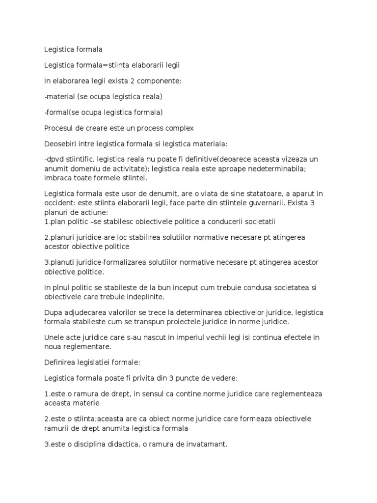 -formal(se ocupa legistica formala) Procesul de creare este un process complex Deosebiri intre legistica formala si legistica materiala: -dpvd stiintific, legistica reala nu poate fi definitive(deoarece aceasta vizeaza un anumit domeniu de activitate); legistica reala este aproape nedeterminabila; imbraca toate formele stiintei. Legistica formala este usor de denumit, are o viata de sine statatoare, a aparut in occident: este stiinta elaborarii legii, face parte din stiintele guvernarii. Exista 3 planuri de actiune: [Link] politic se stabilesc obiectivele politice a conducerii societatii [Link] juridice-are loc stabilirea solutiilor normative necesare pt atingerea acestor obiective politice [Link] juridice-formalizarea solutiilor normative necesare pt atingerea acestor obiective politice. In plnul politic se stabileste de la bun inceput cum trebuie condusa societatea si obiectivele care trebuie indeplinite. Dupa adjudecarea valorilor se trece la determinarea obiectivelor juridice, legistica formala stabileste cum se transpun proiectele juridice in norme juridice. Unele acte juridice care s-au nascut in imperiul vechii legi isi continua efectele in noua reglementare. Definirea legislatiei formale: Legistica formala poate fi privita din 3 puncte de vedere: [Link] o ramura de drept, in sensul ca contine norme juridice care reglementeaza aceasta materie [Link] o stiinta;aceasta are ca obiect norme juridice care formeaza obiectivele ramurii de drept anumita legistica formala [Link] o disciplina didactica, o ramura de invatamant.