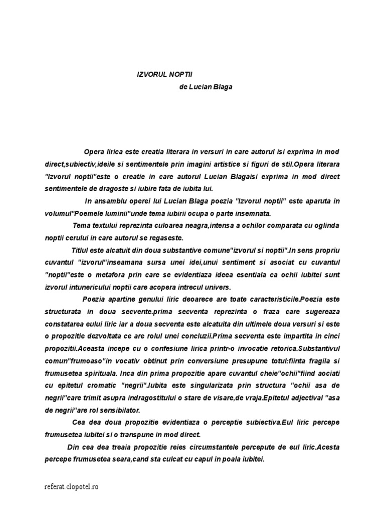 Opera lirica este creatia literara in versuri in care autorul isi exprima in mod direct,subiectiv,ideile si sentimentele prin imagini artistice si iguri de stil!Opera literara "I#vorul noptii"este o creatie in care autorul Lucian Blagaisi exprima in mod direct sentimentele de dragoste si iubire ata de iubita lui! In ansamblu operei lui Lucian Blaga poe#ia "I#vorul noptii" este aparuta in volumul"Poemele luminii"unde tema iubirii ocupa o parte insemnata! Tema textului repre#inta culoarea neagra,intensa a oc$ilor comparata cu oglinda noptii cerului in care autorul se regaseste! Titlul este alcatuit din doua substantive comune"i#vorul si noptii"!In sens propriu cuvantul "i#vorul"inseamana sursa unei idei,unui sentiment si asociat cu cuvantul "noptii"este o meta ora prin care se evidentia#a ideea esentiala ca oc$ii iubitei sunt i#vorul intunericului noptii care acopera intrecul univers! Poe#ia apartine genului liric deoarece are toate caracteristicile!Poe#ia este structurata in doua secvente!prima secventa repre#inta o ra#a care sugerea#a constatarea eului liric iar a doua secventa este alcatuita din ultimele doua versuri si este o propo#itie de#voltata ce are rolul unei conclu#ii!Prima secventa este impartita in cinci propo#itii!%ceasta incepe cu o con esiune lirica printr&o invocatie retorica!'ubstantivul comun" rumoaso"in vocativ obtinut prin conversiune presupune totul( iinta ragila si rumusetea spirituala! Inca din prima propo#itie apare cuvantul c$eie"oc$ii" iind aociati cu epitetul cromatic "negrii"!Iubita este singulari#ata prin structura "oc$ii asa de negrii"care trimit asupra indragostitului o stare de visare,de vra)a!*pitetul ad)ectival "asa de negrii"are rol sensibilator! +ea dea doua propo#itie evidentia#a o perceptie subiectiva!*ul liric percepe rumusetea iubitei si o transpune in mod direct! ,in cea dea treaia propo#itie reies circumstantele percepute de eul liric!%cesta percepe rumusetea seara,cand sta culcat cu capul in poala iubitei!