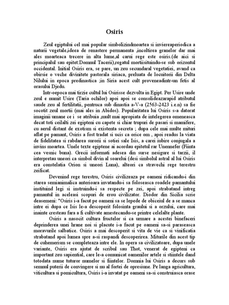 Zeul egiptului cel mai popular simbolizindmoartea si inviereaperiodica a naturii vegetale,ideea de renastere permanenta ,incoltirea granelor dar mai ales moarteaca trecere in alta lume,al carui rege este osiris.(de aici si principalul sau epitet:Domnul Tacerii),regatul mortiisituindu-se sub orizontul occidental. Initial Osiris era, se pare, un zeu secundaral vegetatiei, avand ca obirsie o veche divinitete pastorala siriaca, preluata de locuitorii din Delta ilului in epoca predinastica !in "iria acest cult proveneadintr-un #etis al orasului D$edu. Intr-oepoca mai tirzie cultul lui Osirisse dezvolta in %gipt. &er 'sire unde zeul e numit 'sire (Taria ochilor) apoi apoi se consolideazarapid atributul saude zeu al #ertilitatii, pentruca sub dinastia a-(-a ()*+,-)-), i.e.n) sa #ie socotit zeul mortii (mai ales in .bidos). &opularitatea lui Osiris s-a datorat imaginii umane ce i se atribuia ,mult mai apropiata de intelegerea omeneasca decat toti ceilalti zei egipteni cu capete si chiar trupuri de pasari si mami#ere, cu aerul distant de e/otism si e/istenta secreta ! dupa cele mai multe mituri a#lat pe pamant, Osiris a #ost tradat si ucis ca orice om , apoi readus la viata de #idelitatea si rabdarea surorii si sotiei sale Isis, a carei iubire con$ugala a invins moartea. 'nele te/te egiptene ai acordau epitetul rar 'nenne#er (0iinta cea vesnic buna). 1recii in#ormati adesea din surse nesigure si tarzii, il interpretau uneori ca simbol divin al soarelui (desi simbolul astral al lui Osiris era constelatia Orion si uneori 2una), alteori ca stravechi rege terestru zei#icat. Devenind rege terestru, Osiris civilizeaza pe oameni ridicandu-i din starea semianimalica anterioara invatandu-i sa #oloseasca roadele pamantului instituind legi si instruindu-i sa respecte pe zei, apoi strabatand intreg pamantul in aceleasi scopuri de erou civilizator. Diodor din "icilia scrie deasemeni: 3Osiris i-a #acut pe oameni sa se lepede de obiceiul de a se manca intre ei dupa ce Isis le-a descoperit #olosinta graului si a orzului, care mai inainte cresteau #ara a #i cultivate amestecandu-se printre celelalte plante. Osiris a nasocit cultura #ructelor si ca urmare a acestei bine#aceri deprinderea unei hrane noi si placute i-a #acut pe oameni sa-si paraseasca moravurile salbatice. Osiris a mai descoperit si vita de vie ca si vini#icatia strabatand apoi lumea spre a-si raspandi descoperirea. 4iturile din acest tip de cuhemerism se completeaza intre ele. In opera sa civilizatoare, dupa unele variante, Osiris era a$utat de scribul sau Thot, venerat de egipteni ca important zeu sapiential, care le-a comunicat oamenilor artele si stiintele dand totodata nume tuturor numelor si #iintelor. Domnia lui Osiris a decurs sub semnul puterii de convingere si nu al #ortei de opresiune. &e langa agricultura, viticultura si pomicultura, Osiris i-a invatat pe oameni sa-si construiasca orase