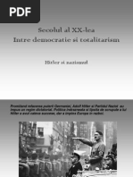 putea veni la Dntrunire si ar distruge-o, dar #itler asta Dsi dorea. El a presupus corect ca asta doar ar e*tinde miscarea (azEndu-se pe frica germanilor de o revolutie comunista. +e $4 fe(ruarie 19$%, #itler a intrat in sala unde a gasit $%%% de oameni care asteptau sa Dnceapa Dntrunirea. +rintre acestia era un numar considera(il de comunisti care doreau sa distruga adunarea. )a cEteva minute dupa inceperea discursului lui #itler, comunistii au inceput sa scandeze lozinci si astfel au stErnit tara(oiul, dar dupa cum sperase #itler, comunistii erau prea putini si astfel lozincile au fost acoperite de aplauzele celor adunati. 'poi el a prezentat cele $5 de articole ale cu privire la +artidul German al ,uncii, Dntrunirea a fost un succes. [Link] aproape 4 ore sala incepea sa se goleasca si multimea, umar la umar, se indrepta usor spre iesire, mi-am dat seama ca principiile unei miscari care nu va fi uitata niciodata se transmiteau printre oameni.8 - ,ein >ampf / !ot in 19$% #itler a adus, ca sim(ol oficial al miscarii, s?asti9a odata cu un nume nou4 +artidul 2ational ocialist al ,uncitorilor din Germania - pe scurt +artidul 2azist /. )a sfErsitul anului 19$% partidul numara de0a 3%%% de oameni. Fn scurt timp #itler si-a facut un renume in Germania, ca fiind un om capa(il sa conduca tara si sa o fereasca de o revolutie comunista similara cu ceea din 1usia. 'stfel, Dn 19$1, #itler s-a dus la 3erlin sa caute spri0in din partea celorlalte partide nationaliste. :eilalti lideri ai +artidului 2azist erau insa sceptici, gelosi si nu doreau ca #itler sa conduca partidul. 'stfel, in timp ce el era la 3erlin, ceilalti lideri au format o alianta cu un alt partid nationalist din 'ugs(urg pentru a-l detrona pe #itler. El a demonstrat Dnca o data la 3erlin capa(ilitatile sale manipulative politice, iar pe 11 iulie 19$1 s-a intors la ,unc"en si a demisionat din +artidul 2azist. :eilalti lideri ai partidului si-au dat in curEnd seama de greseala facuta, demisia lui #itler insemna pierdere avanta0elor partidului si c"iar distrugereu lui. Insa si #itler si-a dat seama ca fara el partidul va pieri si a trimis o scrisoare liderilor partidului prin care spunea ca va veni inapoi doar daca va fi numit presedinte al partidului si va avea putere suprema. +artidul a supus la vot propunerile lui #itler si in urma voturilor, 543 pentru si numai 1 impotriva sa, el a a0uns noul lider al partidului. +e $9 iulie 19$1 #itler s-a prezentat multimii su( titulatura de 8@u"rer8, nume pe care-l va purta toata viata. +ana in 19$3 partidul numara 55.%%% de mem(ri si in noiem(rie 19$3 #itler a condus 83eer #all +utsc"8, miscare care a incercat sa do(oare guvernul din 3avaria si eventual pe cel din 3erlin, dar care nu a avut succes. 'ceasta incercare a fost impiedicata de caderea economica care a lovit Germania. farsitul a fost dramatic iar #itler si alti lideri nazisti au a0uns la inc"isoare. In inc"isoare el a scris faimoasa auto(iografie ,ein >ampf. coaterea nazismului in afara legii a dus la cresterea popularitatii acestuia printre tineretul german. .e cand a iesit din inc"isoare si pana in anul 1933 a fost o perioada de liniste deplina in care nu s-a intamplat nimic cu e*ceptia faptului ca +artidul 2azist se e*tindea foarte repede. In acesti ani s-a format organizatia !ineretul #itlerist. In 1933, datorita capa(ilitatilor de foarte (un politician ale lui #itler, el si partidul sau au luat cu asalt guvernul si au format 81eic"8-ul. 'l treilea 1eic". +ro(a(il