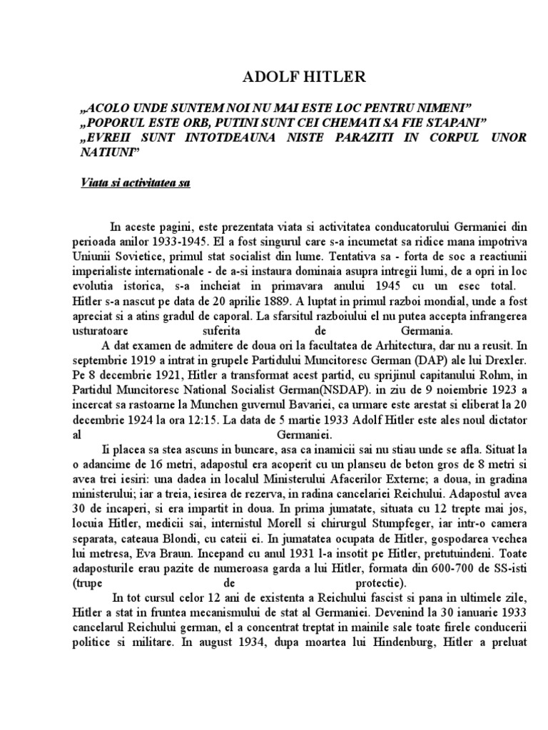 ACOLO UNDE SUNTEM NOI NU MAI ESTE LOC PENTRU NIMENI POPORUL ESTE ORB, PUTINI SUNT CEI CHEMATI SA FIE STAPANI EVREII SUNT INTOTDEAUNA NISTE PARAZITI IN CORPUL UNOR NATIUNI Viata si activitatea sa In aceste pagini, este prezentata viata si activitatea conducatorului Germaniei din perioada anilor 1933-1945. El a fost singurul care s-a incumetat sa ridice mana impotriva Uniunii ovietice, primul stat socialist din lume. !entativa sa - forta de soc a reactiunii imperialiste internationale - de a-si instaura dominaia asupra intregii lumi, de a opri in loc evolutia istorica, s-a inc"eiat in primavara anului 1945 cu un esec total. #itler s-a nascut pe data de $% aprilie 1&&9. ' luptat in primul raz(oi mondial, unde a fost apreciat si a atins gradul de caporal. )a sfarsitul raz(oiului el nu putea accepta infrangerea usturatoare suferita de Germania. ' dat e*amen de admitere de doua ori la facultatea de 'r"itectura, dar nu a reusit. In septem(rie 1919 a intrat in grupele +artidului ,uncitoresc German -.'+/ ale lui .re*ler. +e & decem(rie 19$1, #itler a transformat acest partid, cu spri0inul capitanului 1o"m, in +artidul ,uncitoresc 2ational ocialist German-2 .'+/. in ziu de 9 noiem(rie 19$3 a incercat sa rastoarne la ,unc"en guvernul 3avariei, ca urmare este arestat si eli(erat la $% decem(rie 19$4 la ora 1$415. )a data de 5 martie 1933 'dolf #itler este ales noul dictator al Germaniei. Ii placea sa stea ascuns in (uncare, asa ca inamicii sai nu stiau unde se afla. ituat la o adancime de 15 metri, adapostul era acoperit cu un planseu de (eton gros de & metri si avea trei iesiri4 una dadea in localul ,inisterului 'facerilor E*terne6 a doua, in gradina ministerului6 iar a treia, iesirea de rezerva, in radina cancelariei 1eic"ului. 'dapostul avea 3% de incaperi, si era impartit in doua. In prima 0umatate, situata cu 1$ trepte mai 0os, locuia #itler, medicii sai, internistul ,orell si c"irurgul tumpfeger, iar intr-o camera separata, cateaua 3londi, cu cateii ei. In 0umatatea ocupata de #itler, gospodarea vec"ea lui metresa, Eva 3raun. Incepand cu anul 1931 l-a insotit pe #itler, pretutuindeni. !oate adaposturile erau pazite de numeroasa garda a lui #itler, formata din 5%%-7%% de -isti -trupe de protectie/. In tot cursul celor 1$ ani de e*istenta a 1eic"ului fascist si pana in ultimele zile, #itler a stat in fruntea mecanismului de stat al Germaniei. .evenind la 3% ianuarie 1933 cancelarul 1eic"ului german, el a concentrat treptat in mainile sale toate firele conducerii politice si militare. In august 1934, dupa moartea lui #inden(urg, #itler a preluat