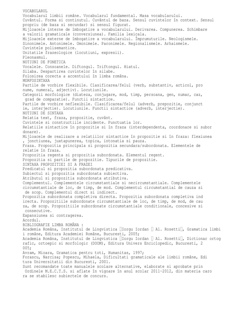 Sensul cuvintelor n context. Sensul propriu (de baza si secundar) si sensul figurat. Mijloacele interne de mbogatire a vocabularului. Derivarea. Compunerea. Schimbare a valorii gramaticale (conversiunea). Familia lexicala. Mijloacele externe de mbogatire a vocabularului. mprumuturile. Neologismele. Sinonimele. Antonimele. Omonimele. Paronimele. Regionalismele. Arhaismele. Cuvintele polisemantice. Unitatile frazeologice (locutiuni, expresii). Pleonasmul. NOTIUNI DE FONETICA Vocalele. Consoanele. Diftongul. Triftongul. Hiatul. Silaba. Despartirea cuvintelor n silabe. Folosirea corecta a accentului n limba romna. MORFOSINTAXA Partile de vorbire flexibile. Clasificarea/felul (verb, substantiv, articol, pro nume, numeral, adjectiv). Locutiunile. Categorii morfologice (diateza, conjugare, mod, timp, persoana, gen, numar, caz, grad de comparatie). Functii sintactice. Partile de vorbire neflexibile. Clasificarea/felul (adverb, prepozitie, conjunct ie, interjectie). Locutiunile. Functii sintactice (adverb, interjectie). NOTIUNI DE SINTAXA Relatia text, fraza, propozitie, cuvnt. Cuvintele si constructiile incidente. Punctuatia lor. Relatiile sintactice n propozitie si n fraza (interdependenta, coordonare si subor donare). Mijloacele de realizare a relatiilor sintactice n propozitie si n fraza: flexiunea , jonctiunea, juxtapunerea, topica, intonatia si pauza. Fraza. Propozitia principala si propozitia secundara/subordonata. Elementele de relatie n fraza. Propozitia regenta si propozitia subordonata. Elementul regent. Propozitia si partile de propozitie. Tipurile de propozitie. SINTAXA PROPOZITIEI SI A FRAZEI Predicatul si propozitia subordonata predicativa. Subiectul si propozitia subordonata subiectiva. Atributul si propozitia subordonata atributiva. Complementul. Complementele circumstantiale si necircumstantiale. Complementele circumstantiale de loc, de timp, de mod. Complementul circumstantial de cauza si de scop. Complementul direct si indirect. Propozitia subordonata completiva directa. Propozitia subordonata completiva ind irecta. Propozitiile subordonate circumstantiale de loc, de timp, de mod, de cau za, de scop. Propozitiile subordonate circumstantiale conditionale, concesive si consecutive. Expansiunea si contragerea. Acordul. BIBLIOGRAFIE LIMBA ROMNA : Al. Rosetti , Gramatica limbi Academia Romna, Institutul de Lingvistica Iorgu Iordan i romne, Editura Academiei Romne, Bucuresti, 2005; Academia Romna, Institutul de Lingvistica Iorgu Iordan Al. Rosetti , Dictionar ortog rafic, ortoepic si morfologic (DOOM), Editura Univers Enciclopedic, Bucuresti, 2 005; Avram, Mioara, Gramatica pentru toti, Humanitas, 1997; Forascu, Narcisa; Popescu, Mihaela, Dificultati gramaticale ale limbii romne, Edi tura Universitatii din Bucuresti, 2001. Sunt recomandate toate manualele scolare alternative, elaborate si aprobate prin Ordinele M.E.C.T.S. si aflate n vigoare n anul scolar 2011-2012, din materia caro ra se stabilesc subiectele de concurs.