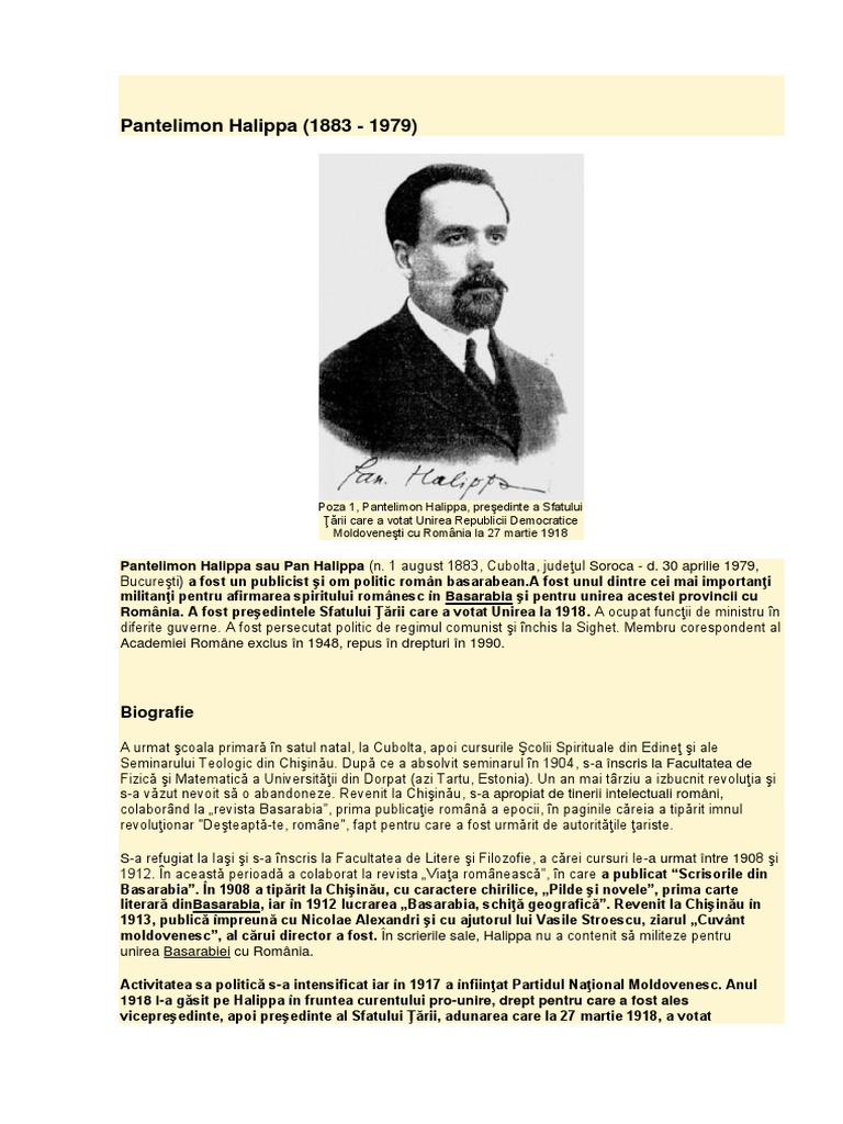Poza 1, Pantelimon Halippa, preedinte a Sfatului rii care a votat Unirea Republicii Democratice Moldoveneti cu Romnia la 27 martie 1918