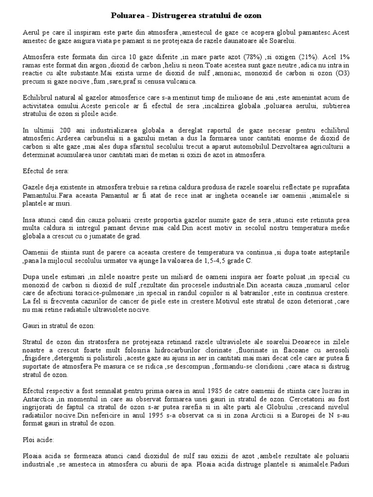 Aerul pe care il inspiram este parte din atmosfera ,amestecul de gaze ce acopera globul [Link] amestec de gaze asigura viata pe pamant si ne protejeaza de razele daunatoare ale Soarelui. Atmosfera este formata din circa 10 gaze diferite ,in mare parte azot (78% ,si o!igen ("1% . Acel 1% ramas este format din argon ,dio!id de carbon ,#eliu si neon.$oate acestea sunt gaze neutre ,adica nu intra in reactie cu alte substante.%ai e!ista urme de dio!id de sulf ,amoniac, mono!id de carbon si ozon (&' precum si gaze nocive ,fum ,sare,praf si cenusa vulcanica. (c#ilibrul natural al gazelor atmosferice care s)a mentinut timp de milioane de ani ,este amenintat acum de activitatea [Link] pericole ar fi efectul de sera ,incalzirea globala ,poluarea aerului, subtierea stratului de ozon si ploile acide. *n ultimii "00 ani industrializarea globala a dereglat raportul de gaze necesar pentru ec#ilibrul [Link] carbunelui si a gazului metan a dus la formarea unor cantitati enorme de dio!id de carbon si alte gaze ,mai ales dupa sfarsitul secolului trecut a aparut automobilul.+ezvoltarea agriculturii a determinat acumularea unor cantitati mari de metan si o!izi de azot in atmosfera. (fectul de sera, -azele deja e!istente in atmosfera trebuie sa retina caldura produsa de razele soarelui reflectate pe suprafata .amantului./ara aceasta .amantul ar fi atat de rece inat ar ing#eta oceanele iar oamenii ,animalele si plantele ar muri. *nsa atunci cand din cauza poluarii creste proportia gazelor numite gaze de sera ,atunci este retinuta prea multa caldura si intregul pamant devine mai cald.+in acest motiv in secolul nostru temperatura medie globala a crescut cu o jumatate de grad. &amenii de stiinta sunt de parere ca aceasta crestere de temperatura va continua ,si dupa toate asteptarile ,pana la mijlocul secolului urmator va ajunge la valoarea de 1,0)1,0 grade 2. +upa unele estimari ,in zilele noastre peste un miliard de oameni inspira aer foarte poluat ,in special cu mono!id de carbon si dio!id de sulf ,rezultate din procesele industriale.+in aceasta cauza ,numarul celor care de afectiuni toracice)pulmonare ,in special in randul copiilor si al batranilor ,este in continua crestere. 3a fel si frecventa cazurilor de cancer de piele este in crestere.%otivul este stratul de ozon deteriorat ,care nu mai retine radiatiile ultraviolete nocive. -auri in stratul de ozon, Stratul de ozon din stratosfera ne protejeaza retinand razele ultraviolete ale soarelui.+eoarece in zilele noastre a crescut foarte mult folosiria #idrocarburilor clorinate ,fluorinate in flacoane cu aerosoli ,frigidere ,detergenti si polistiroli ,aceste gaze au ajuns in aer in cantitati mai mari decat cele care ar putea fi suportate de atmosfera..e masura ce se ridica ,se descompun ,formandu)se cloridioni ,care ataca si distrug stratul de ozon. (fectul respectiv a fost semnalat pentru prima oarea in anul 1480 de catre oamenii de stiinta care lucrau in Antarctica ,in momentul in care au observat formarea unei gauri in stratul de ozon. 2ercetatorii au fost ingrijorati de faptul ca stratul de ozon s)ar putea rarefia si in alte parti ale -lobului ,crescand nivelul radiatiilor nocive.+in nefericire in anul 1440 s)a observat ca si in zona Arcticii si a (uropei de 5 s)au format gauri in stratul de ozon. .loi acide, .loaia acida se formeaza atunci cand dio!idul de sulf sau o!izii de azot ,ambele rezultate ale poluarii industriale ,se amesteca in atmosfera cu aburii de apa. .loaia acida distruge plantele si animalele..aduri
