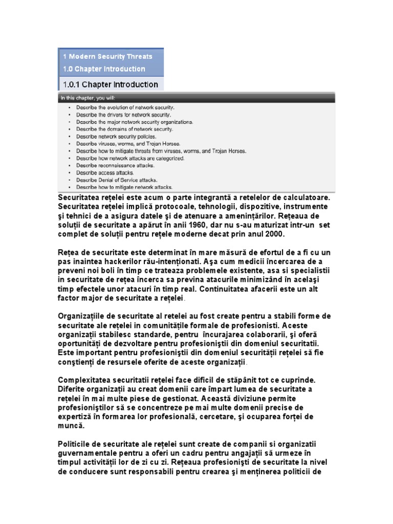 securitate a reelei. .oate practicile de securitate ale reelei se re"er la politica de securitate a reelei. $a cum securitate reelei este compusa din domenii de securitate ale reelei, atacurile de reea sunt clasi"icate, ast"el nc't este mai uor de a nva despre ele i le a%ordeze n mod corespunztor. /irui, viermi, si .ro)an 0orses sunt anumite tipuri de atacuri de reea. 1ai general, atacuri de reea sunt clasi"icate ca recunoatere, de acces, sau atacuri ,enial o" Service. $tenuarea atacurilor de reea este pro%lema unui pro"esionist de securitate de reea. 2n acest capitol, de masterat care nva teoria care stau la %aza de securitate a reelei, care este necesar s se neleag nainte de a ncepe o practic n pro"unzime de securitate a reelei. 1etodele de atenuare atac de reea sunt introduse aici, i punerea n aplicare a acestor metode cuprinde restul acestui curs. Un hands-on pentru laborator capitol, cercetarea atacuri de reea i de audit de securitate Instrumente, ghiduri care nva prin intermediul atacurilor de reea de cercetare i de instrumente de audit de securitate. Laboratorul se gsete n manualul de laborator pe Conexiunea la cademia [Link].