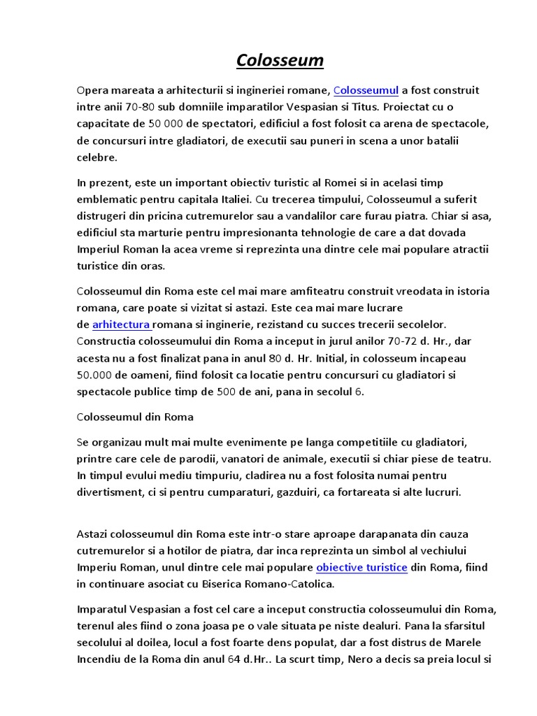 Opera mareata a arhitecturii si ingineriei romane, Colosseumul a fost construit intre anii 70-80 sub domniile imparatilor Vespasian si Titus. Proiectat cu o capacitate de 50 000 de spectatori, edificiul a fost folosit ca arena de spectacole, de concursuri intre gladiatori, de executii sau puneri in scena a unor batalii celebre. In prezent, este un important obiectiv turistic al Romei si in acelasi timp emblematic pentru capitala Italiei. Cu trecerea timpului, Colosseumul a suferit distrugeri din pricina cutremurelor sau a vandalilor care furau piatra. Chiar si asa, edificiul sta marturie pentru impresionanta tehnologie de care a dat dovada Imperiul Roman la acea vreme si reprezinta una dintre cele mai populare atractii turistice din oras. Colosseumul din Roma este cel mai mare amfiteatru construit vreodata in istoria romana, care poate si vizitat si astazi. Este cea mai mare lucrare de arhitectura romana si inginerie, rezistand cu succes trecerii secolelor. Constructia colosseumului din Roma a inceput in jurul anilor 70-72 d. Hr., dar acesta nu a fost finalizat pana in anul 80 d. Hr. Initial, in colosseum incapeau 50.000 de oameni, fiind folosit ca locatie pentru concursuri cu gladiatori si spectacole publice timp de 500 de ani, pana in secolul 6. Colosseumul din Roma Se organizau mult mai multe evenimente pe langa competitiile cu gladiatori, printre care cele de parodii, vanatori de animale, executii si chiar piese de teatru. In timpul evului mediu timpuriu, cladirea nu a fost folosita numai pentru divertisment, ci si pentru cumparaturi, gazduiri, ca fortareata si alte lucruri.