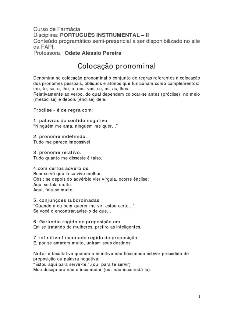 me, te, se, o, lhe, a, nos, vos, se, os, as, lhes. Relativamente ao verbo, do qual dependem colocar-se antes (próclise), no meio (mesóclise) e depois (ênclise) dele.