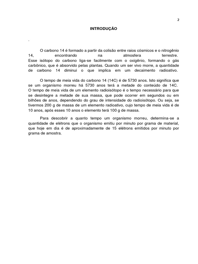 INTRODUO . O carbono 14 formado a partir da coliso entre raios csmicos e o nitrognio 14, encontrando na atmosfera terrestre. Esse istopo do carbono liga-se facilmente com o oxignio, formando o gs carbnico, que absorvido pelas plantas. Quando um ser vivo morre, a quantidade de carbono 14 diminui o que implica em um decaimento radioativo. O tempo de meia vida do carbono 14 (14C) de 5730 anos. Isto significa que se um organismo morreu h 5730 anos ter a metade do contedo de 14C. O tempo de meia vida de um elemento radioistopo o tempo necessrio para que se desintegre a metade de sua massa, que pode ocorrer em segundos ou em bilhes de anos, dependendo do grau de intensidade do radioistopo. Ou seja, se tivermos 200 g de massa de um elemento radioativo, cujo tempo de meia vida de 10 anos, aps esses 10 anos o elemento ter 100 g de massa. Para descobrir a quanto tempo um organismo morreu, determina-se a quantidade de eltrons que o organismo emitiu por minuto por grama de material, que hoje em dia de aproximadamente de 15 eltrons emitidos por minuto por grama de amostra.