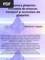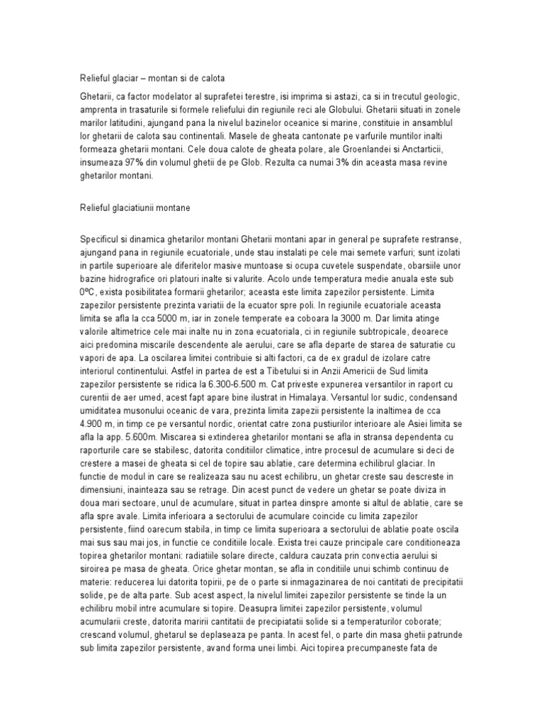 acumulare. Capatul dinainte al limbii ghetarului se termina mai mult sau mai putin abrupt, sub forma unei frunti. Alaturi de actiunea de transport si acumulare, comune si ghetarilor de calota, eroziunea 6e'aratie7 reprezinta un proces deosebit de important pentru modelarea reliefului de catre ghetarii din regiunile de munte. )ntensitatea eroziunii creste o data cu grosimea masei de gheata si cu micsorarea pantelor. 8rocesul de eroziune glaciara este intensificat de contributia materialelor morenice 6blocuri uriase, bolovani, pietrisuri de diferite dimensiuni7, care se afla incorporate pe marginile si la fundul ghetarului. 8rin intermediul acestora, ghetarul scrijeleaza peretii si patul vaii. Aceasta eroziune bruta este dublata de un proces de slefuire, determinat de gheata curata sau amestecata cu particule fine de roca, avand o granulometrie asemanatoare nisipului si care constituie 9faina de ghetar:. Ghetarul desfasoara o puternice eroziune laterala, cat si o eroziune in sens longitudinal. Roca versantilor, afectata de inghet, prezinta fisuri mari, care inlesnesc ghetarului sa smulga mai usor blocuri de roca$ eroziunea laterala largeste mult profilul transversal al vailor glaciare. 3roziunea in profil longitudinal, se deosebeste de aceea a apelor curgatoare prin faptul ca gheata actioneaza mai slab acolo unde panta este mai mare. Cand panta este mai mica, sau cand ghetarul intalneste contrapante si praguri forta lui de eroziune devine ma'ima. Masa de gheata, ajungand deasupra pragului se fisureaza si se fragmenteaza in blocuri, care se vor suda intre ele mai jos pe panta si apasand puternic intensifica eroziunea. )n acest fel, pragurile din cadrul vailor glaciare sunt mai putin supuse eroziunii. Acest mod de a eroda, al ghetarului, in e'cavatiile din fata contrapantelor se numeste subsapare si creeaza profile longitudinale in trepte, compuse din praguri si bazinete sau e'cavatii de subsapare. 3roziunea glaciara are o intensitate diferentiata in functie de sectoarele sau partile componente ale ghetarului. 3roziunea cea mai puternica se manifesta in cadrul vailor, unde masele de gheata curg, preseaza, smulg si tarasc cantitati mari de roca. )n perimetrul circurilor, eroziunea este mai redusa, ea e'[Link] nu atat prin deplasarea ghetii, cat mai ales datorita imensei presiuni cauzata de grosimea foarte mare. ,ipuri de ghetari montani +upa aspectul e'terior se deosebesc mai multe tipuri4 a7Ghetarul alpin sau de vale este bine reprezentat pe varfurile inalte ale Alpilor. #e compune din4 bazin de alimentare cu zapada, circul cu gheata si o limba bine dezvoltata, care coboara mult sub limita zapezilor. ;ona de alimentare este acoperita de o zapada mai densa, grauntoasa, numita firn sau n<v<. ;ona n<v<.ului este permanenta incepand in medie de la altitudinea de "%%% m in sus. 3a aluneca incet alimentand in permanenta circul, ce cantoneaza o mare cantitate de gheata. +in circ, gheata este evacuata continuu prin limba, care aluneca in cadrul unei vai pana la linia de topire. +atorita dezvoltarii mari a limbii, ghetarul se mai numeste si ghetar de vale. =neori limbile prezinta ramificatii, ajungand sa ia aspect de retea. +e asemenea ele se pot uni prin confluente. 5 caracteristica in plus a acestui ghetar este prezenta multor morene de fund. =nul din cei mai mari ghetari de vale este >edcen?o din 8amir, lung de ?m$ )n Alpi, ghetarul Aletsch are @2 ?m. b7Ghetarul pirinean are ca specific prezenta masei de gheata numai in interiorul circului. 3ste mic si lipsit de limba. Restrangerea ghetarului este determinata de conditiile climatice, relativ secetoase, si de limita zapezilor persistente mai ridicata$ ablatia impiedica formarea limbilor de gheata. Ghetarul fiind cantonat doar in cadrul circului a primit denumirea de ghetar suspendat sau de circ. Are multe morene de suprafata si interioare, dar nu prezinta morene de fund. 3ste tipul de ghetar specific muntilor 8irinei. 8entru muntii din RomAnia, el a fost specific fazei glaciare BCrm, cand majoritatea ghetarilor [Link] retras limbile, ramanand numai in circuri. c7Ghetarul de platou se intalneste foarte rar, avand forma unei mici calote de gheata. #e instaleaza in zonele cu