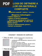 Principalul criteriu de alegere a materialului matricei compozitului il reprezinta temperatura de lucru. Astfel, se disting trei tipuri de matrici: - matricea polimerica cu temperatura de lucru < 200 C; - matricea metalica cu temperatura de lucru < 600 C, cu exceptia superaliajelor pe baza de Ni si Co care pot depasi 900 C; - matricea ceramica cu temperatura de lucru > 2500 C; 13.1. Matrice polimerica In functie de proprietatile materialelor compozite obtinute, polimerii utilizati ca matrice se pot grupa in trei clase: Polimeri cu performante medii: - termoplastici polipropilena; - termoreactivi fenoplaste; - elastomeri de uz general; Polimeri cu inalte performante, dar cu termostabilitate redusa: - termoplastici poliamide, poliesteri saturati, s.a.; - termoreactivi poliesteri nesaturati, rasini epoxidice, s.a.; - elastomeri poliuretani; Polimeri termostabili cu performante ridicate: - termoplastici; - termoreactivi poliimide, s.a.; - elastomeri siliconici; 13.1.1. Principalele aplicatii ale materialelor compozite cu matrice polimerica Caracteristica de baza a compozitelor polimerice consta in raportul foarte ridicat rezistenta/[Link] acestui fapt, materialele compozite polimerice au devenit indispensabile pentru dezvoltarea unor domenii de varf precum microelectronica, tehnica medicala, constructiile aerospatiale, industria de automobile, industria navala etc. Este relevant un singur exemplu: la construirea modulului lunar al navetei spatiale Apollo 11, circa 75% din materialele utilizate au fost compozite polimerice, iar in cazul navetei spatiale Discovery, acest procent a ajuns la 87%. Si in industria navala utilizarea compozitelor polimerice a atins un ritm galopant, plecand de la partile submersibile ale vapoarelor si ajungand pana la echipamente ultracomplexe de foraj marin.