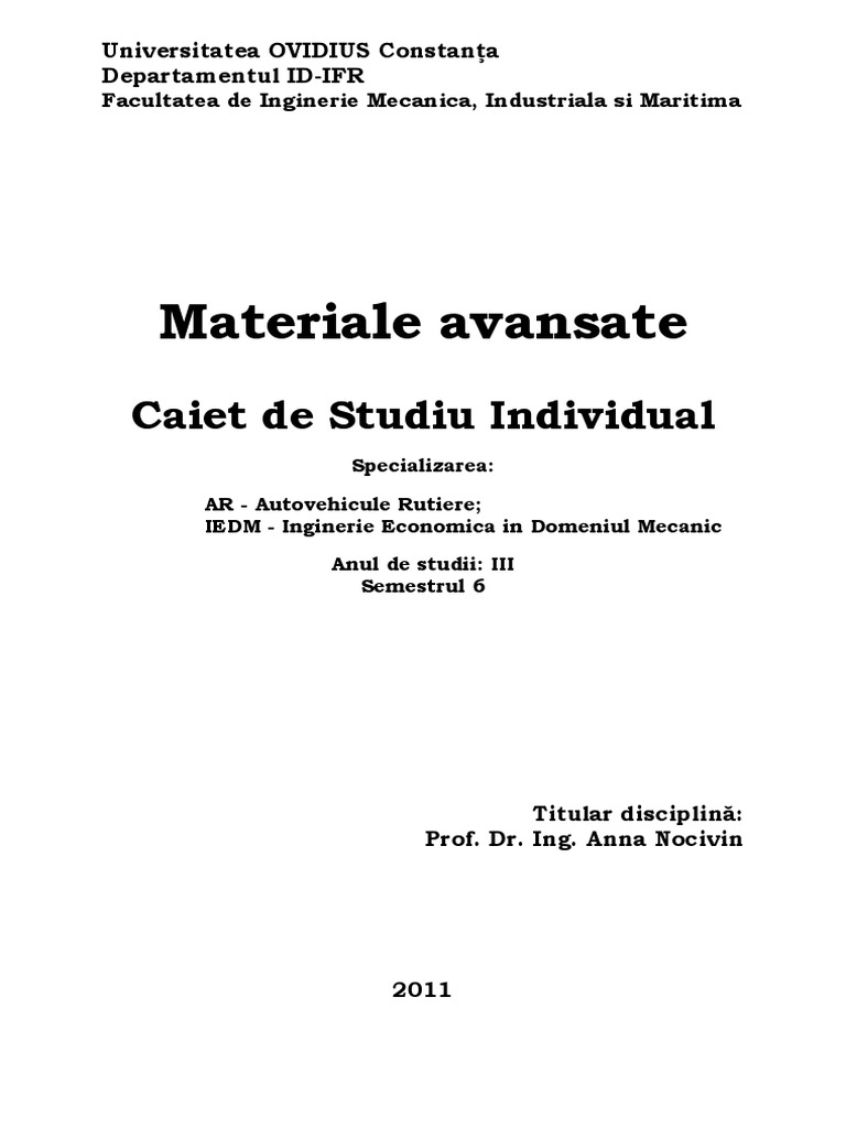 Lucrarea de fa este adresat tuturor studenilor de la specializrile universitare de licen de inginerie mecanic, care studiaz la forma de nvmnt cu frecven redus IFR, n cadrul Facultii de Inginerie Mecanic, Industrial i Maritim, Universitatea Ovidius Constana, unde mi desfor activitatea n prezent. Lucrarea i propune s pun la dispoziie, ntr-o prezentare succint i selectiv, noiunile de baz legate de compoziia, structura, proprietile i aplicaiile ctorva din principalele clase de materiale avansate utilizate n momentul de fa n industrie, materiale care de altfel i reprezint criteriul de departajare pe capitole a lucrrii: 1) materiale metalice cu proprieti magnetice speciale; 2) materiale supraconductoare; 3) materiale metalice cu memoria formei; 4) materiale metalice amorfe i nanocristaline; 5) materiale metalice cu proprieti termice i elastice speciale; 6) materiale metalice rezistente la radiaii; 7) materiale compozite. Termenul de materiale avansate care cuprinde fie compozite pe baz de fibre de carbon i kevlar, fie nanomateriale sau materiale nanostructurate, fie materiale cu memoria formei, materiale metalice amorfe sau alte numeroase tipuri de materiale cu proprieti speciale, total diferite de materialele metalice clasice, reprezint realitatea a muli ani de cercetare, n special ultimii 50 de ani, n care o serie de industrii au renunat parial sau integral la materialele tradiionale i au impus o nou generaie de materiale care ofer compoziii i proprieti inginereti inovative. Domenii tiinifice i industrii de vrf, cum sunt medicina, industria IT, industria de autoturisme, industria aerospaial i multe altele, au neles de mult acest deziderat de nlocuire a materialelor clasice cu materiale moderne, cu caracteristici tehnicofuncionale i economice superioare, transformndu-l n realitate. Iat de ce, sperm ca lucrarea de fa s incite interesul cititorului-student pentru acest domeniu att de important al materialelor metalice avansate, determinndu-l s-i extind aria de interes i dorina de aprofundare a cunotinelor acumulate pentru o mai bun desvrire profesional. Sperm, de asemenea, ca prin formatul sau sintetic, n care se evideniaz uor cuvintele cheie, noiunile de baz, precum i obiectivele i concluziile fiecrui capitol, lucrarea de fa s fie un instrument eficient de studiu pentru studenii formei de nvmnt cu frecven redus, care au astfel posibilitatea s aprofundeze mai uor prin studiu individual ntregul bagaj informaional impus prin programa analitic a disciplinei.
