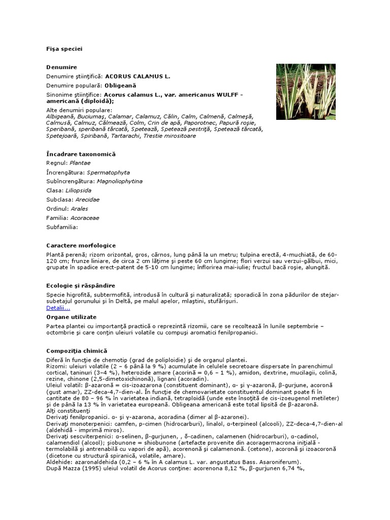 , var. americanus WULFF american (diploid); Alte denumiri populare: Albigean, Buciuma, Calamar, Calamuz, Clin, Calm, Calmen, Calme, Calmus, Calmuz, Clmeaz, Colm, Crin de ap, Paporotnec, Papur roie, Speriban, speriban trcat, Speteaz, Speteaz pestri, Speteaz trcat, Spetejoar, Spiriban, Tartarachi, Trestie mirositoare ncadrare taxonomic Regnul: Plantae ncrengtura: Spermatophyta Subncrengtura: Magnoliophytina Clasa: Liliopsida Subclasa: Arecidae Ordinul: Arales Familia: Acoraceae Subfamilia: Caractere morfologice Plant peren; rizom orizontal, gros, crnos, lung pn la un metru; tulpina erect, 4-muchiat, de 60120 cm; frunze liniare, de circa 2 cm lime i peste 60 cm lungime; flori verzui sau verzui-glbui, mici, grupate n spadice erect-patent de 5-10 cm lungime; nflorirea mai-iulie; fructul bac roie, alungit. Ecologie i rspndire Specie higrofit, subtermofit, introdus n cultur i naturalizat; sporadic n zona pdurilor de stejarsubetajul gorunului i n Delt, pe malul apelor, mlatini, stufriuri. Detalii... Organe utilizate Partea plantei cu importan practic o reprezint rizomii, care se recolteaz n lunile septembrie octombrie i care conin uleiuri volatile cu compui aromatici fenilpropanici. Compoziia chimic Difer n funcie de chemotip (grad de poliploidie) i de organul plantei. Rizomi: uleiuri volatile (2 6 pn la 9 %) acumulate n celulele secretoare dispersate n parenchimul cortical, taninuri (34 %), heterozide amare (acorin = 0,6 1 %), amidon, dextrine, mucilagii, colin, rezine, chinone (2,5-dimetoxichinon), lignani (acoradin). Uleiul volatil: -azaron = cis-izoazarona (constituent dominant), - i -azaron, -gurjune, acoron (gust amar), ZZ-deca-4,7-dien-al. n funcie de chemovarietate constituentul dominant poate fi n cantitate de 80 96 % n varietatea indian, tetraploid (unde este nsoit de cis-izoeugenol metileter) i de pn la 13 % n varietatea european. Obligeana american este total lipsit de -azaron. Ali constitueni Derivai fenilpropanici. - i -azarona, acoradina (dimer al -azaronei). Derivai monoterpenici: camfen, p-cimen (hidrocarburi), linalol, -terpineol (alcooli), ZZ-deca-4,7-dien-al (aldehid - imprim miros). Derivai sescviterpenici: -selinen, -gurjunen, , -cadinen, calamenen (hidrocarburi), -cadinol, calamendiol (alcool); iobunone = shiobunone (artefacte provenite din acoragermacrona iniial termolabil i antrenabil cu vapori de ap), acorenon i calamenon. (cetone), acoron i izoacoron (dicetone cu structur spiranic, volatile, amare). Aldehide: azaronaldehida (0,2 6 % n A calamus L. var. angustatus Bass. Asaroniferum). Dup Mazza (1995) uleiul volatil de Acorus conine: acorenona 8,12 %, -gurjunen 6,74 %,