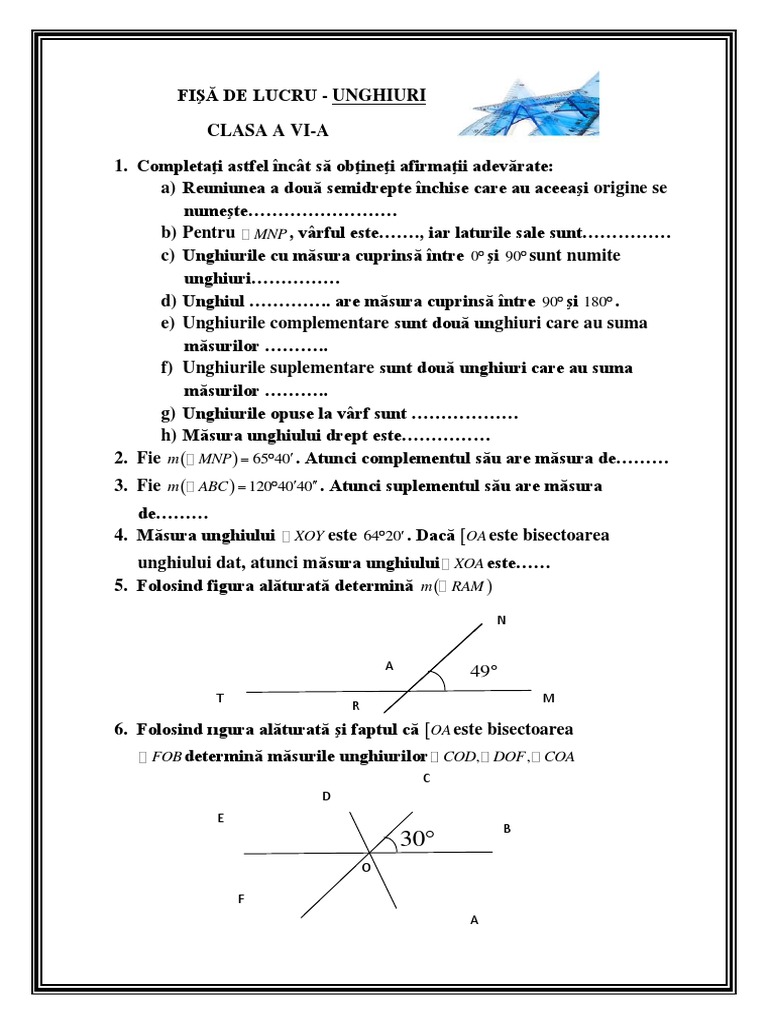 Completai astfel nct s obinei afirmaii adevrate: a) Reuniunea a dou semidrepte nchise care au aceeai origine se numete. b) Pentru MNP , vrful este., iar laturile sale sunt c) Unghiurile cu msura cuprins ntre 0 i 90 sunt numite unghiuri d) Unghiul .. are msura cuprins ntre 90 i 180 . e) Unghiurile complementare sunt dou unghiuri care au suma msurilor .. f) Unghiurile suplementare sunt dou unghiuri care au suma msurilor .. g) Unghiurile opuse la vrf sunt h) Msura unghiului drept este 2. Fie m MNP 6540 . Atunci complementul su are msura de 3. Fie m ABC 1204040 . Atunci suplementul su are msura de 4. Msura unghiului