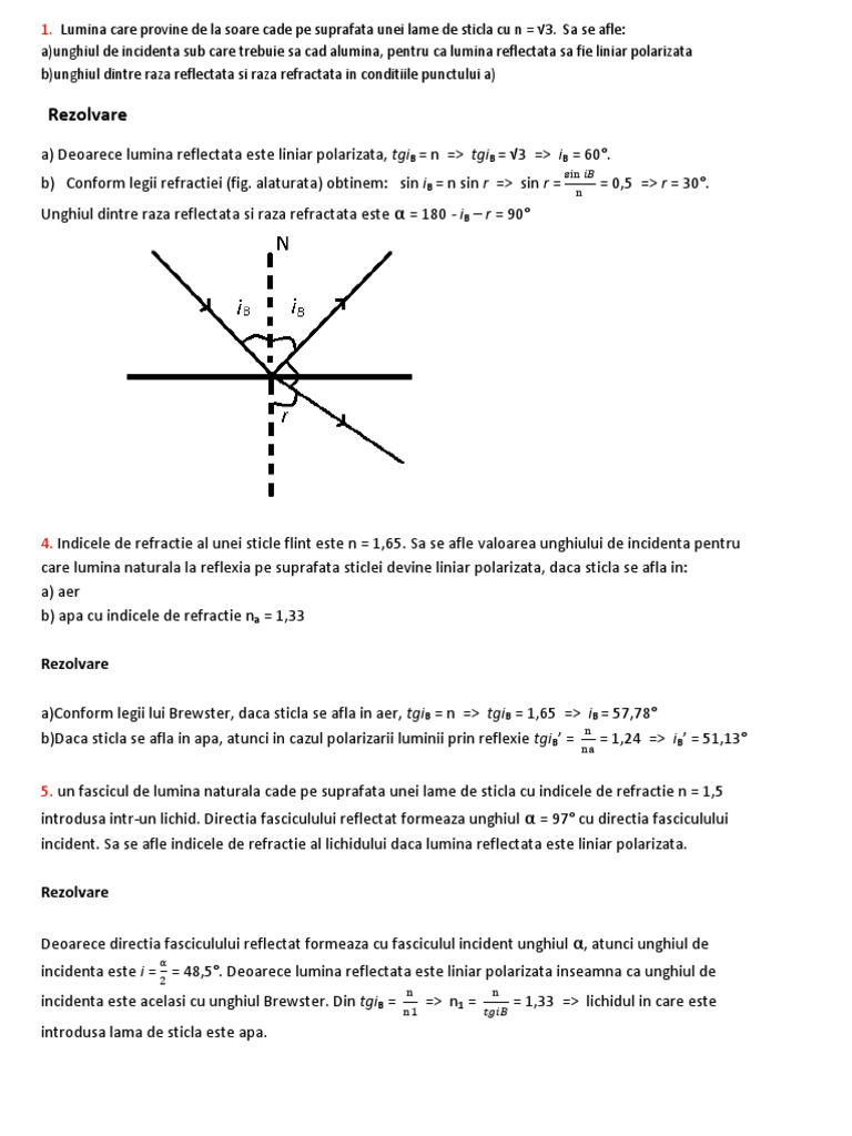 5. un fascicul de lumina naturala cade pe suprafata unei lame de sticla cu indicele de refractie n = 1,5 introdusa intr-un lichid. Directia fasciculului reflectat formeaza unghiul = 97 cu directia fasciculului incident. Sa se afle indicele de refractie al lichidului daca lumina reflectata este liniar polarizata. Rezolvare Deoarece directia fasciculului reflectat formeaza cu fasciculul incident unghiul , atunci unghiul de incidenta este i = = 48,5. Deoarece lumina reflectata este liniar polarizata inseamna ca unghiul de incidenta este acelasi cu unghiul Brewster. Din tgiB = introdusa lama de sticla este apa. => n1 = = 1,33 => lichidul in care este