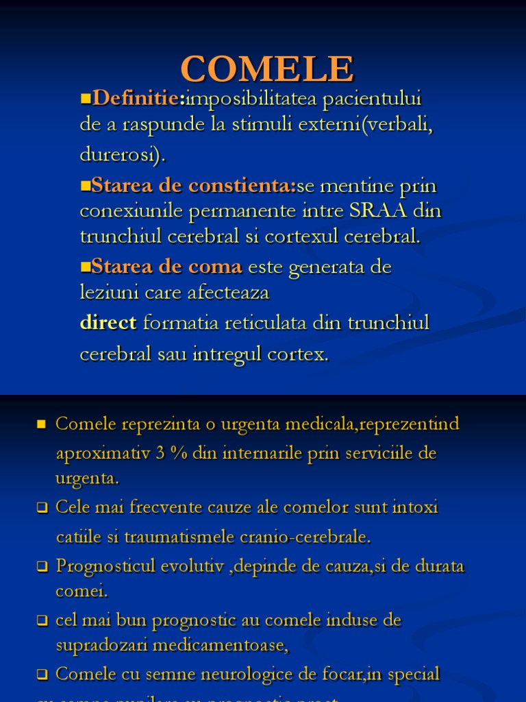Comele reprezinta o urgenta medicala,reprezentind aproximativ 3 % din internarile prin serviciile de urgenta. Cele mai frecvente cauze ale comelor sunt intoxi catiile si traumatismele cranio-cerebrale. Prognosticul evolutiv ,depinde de cauza,si de durata comei. cel mai bun prognostic au comele induse de supradozari medicamentoase, Comele cu semne neurologice de focar,in special cu semne pupilare,au prognostic prost.