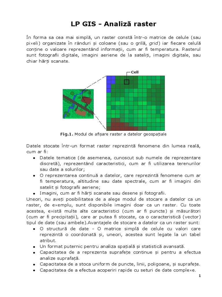 Caracteristicile generale ale datelor raster n seturile de date raster, fiecare celul (care este, de asemenea, cunoscut ca un pixel) are o valoare. Valorile celulelor reprezint fenomenul descris de setul de date raster, cum ar fi o categorie, magnitudine, nlimea, sau valoarea spectral. O categorie ar putea fi o clas de utilizare a terenurilor, cum ar fi pune, pdure, sau pe drum. O magnitudine ar putea reprezenta poluarea sonor, sau procentul de precipitaii. nlimea (distana) ar putea reprezenta altitudine suprafa deasupra nivelului mrii, care pot fi utilizate pentru a obine pant, aspect, i proprieti bazinelor hidrografice. Valorile spectrale sunt utilizate n imaginile satelitare i fotografii aeriene pentru a reprezenta reflexie a luminii i culorii. Dimensiunea a celulelor poate fi la fel de mare sau de mic dup cum este necesar pentru a reprezenta suprafaa transmis. Dimensiunea celulei determin ct de grosier sau fin vor aprea modelele sau caracter isticile n reprezentarea raster. Fiind mai mici, dimensiunea celulei, rasterul va fi mai fin sau mai detaliat. Cu toate acestea, cu ct este mai mare numrul de celule, cu att mai mult va dura pentru a procesa i va crete cererea pentru spaiu de stocare.