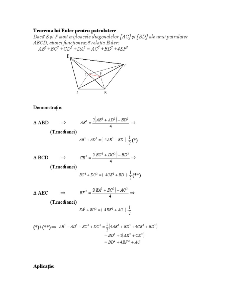 Teorema lui Euler pentru patrulatere Dac E i F sunt mijloacele diagonalelor [AC] i [BD] ale unui patrulater ABCD,