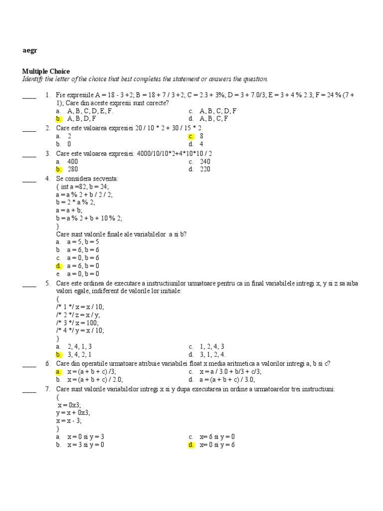 ____ 12. Daca a, b sunt variabile de tip int, iar x si y sunt variabile de tip float, stabiliti care dintre urmatoarele secvente