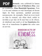 Spune-i cuiva Mi-e dor de tine! Vorbeste cu Dumne eu. !edevino" copilul de altadata. Sari coarda. #ita cuvantul ranc$iuna. Spune D%. &ine-ti promisiunile. !a i! Cere a'utor. Sc$imba-ti pieptanatura. (u)i"". Canta"". %minteste-ti de o aniversare. %'uta un om sarac. &ermina un proiect. *andeste! Iesi pentru a te distra. +fera-te voluntar. !asfata-te intr-o baie cu spuma. (a cuiva o favoare. %sculta cantecul )reierilor. Visea a cu oc$ii desc$isi. Inc$ide televi orul si vorbeste. (ii amabil! Da-ti voie sa )resesti. Iarta! Multumeste-i lui Dumne eu pentru soare. %rata-ti desc$is fericirea. (a un cadou. %ccepta un compliment. ,riveste atent o floare. Inter ice-ti sa spui Nu pot! timp de o i. &raieste-ti clipa! Continua o traditie a familiei. Incepe o alta i. %sta i nu iti face )ri'i! -.ersea a cura'ul in lucrurile mici. %'uta un vecin la )reu. Man)aie un copil care sufera. %sculta un prieten. ,riveste foto)rafiile vec$i. Ima)inea a-ti valurile marii. /oaca-te cu 'ucaria ta preferata. Da-ti voie sa fii simpatic. Saluta-ti primul noul vecin. (a pe cineva sa se simta bine-venit. ,romite cuiva ca il vei a'uta. %minteste-ti ca nu esti sin)ur. 0auda intreit o fapta buna. ,rimeste in sufletul tau si in casa ta un catel de pe strada. 1raneste-l! Vorbeste-i! ,astrea a-l! Ster)e lacrimile de pe un obra . Cumpara-ti o ciocolata. Imparte-o cu un pofticios. (ii iar curios. *aseste un lucru nou2 ceva frumos2 ceva interesant. Da-te in lea)an. Citeste o poveste. ,ovesteste-o unui copil. Scrie o poe ie. Daruieste-o 'umatatii tale. Stai drept. Sadeste un copac. Multumeste-le celor de la care ai invatat. Sadeste si tu un arbore al vietii in inima si sufletul cuiva!
