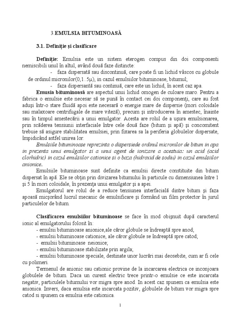 Definiie i clasificare Definiie: Emulsia este un sistem eterogen compus din doi componenti nemiscibili unul n altul, avnd dou faze distincte: - faza dispersat sau discontinu, care poate fi un lichid vscos cu globule de ordinul micronilor(0,1..5), in cazul emulsiilor bituminoase, bitumul; - faza dispersant sau continu, care este un lichid, n acest caz apa. Emusia bituminoas are aspectul unui lichid omogen de culoare maro. Pentru a fabrica o emulsie este necesar s se pun n contact cei doi componeni, care au fost adui ntr-o stare fluid apoi este necesar o energie mare de dispersie (mori coloidale sau malaxoare centrifugale de mare vitez), precum i introducerea n amestec, nainte sau n timpul amestecrii a unui emulgator. Acesta are rolul de a uura emulsionarea, prin scderea tensiunii interfaciale ntre cele dou faze (bitum i ap) i concomitent trebuie s asigure stabilitatea emulsiei, prin fixarea sa la periferia globulelor dispersate, mpidicnd astfel unirea lor. Emulsiile bituminoase reprezinta o dispersiede ordinul micronilor de bitum in apa in prezenta unui emulgator si a unui agent de ionizare a acestuia: un acid (acid clorhidric) in cazul emulsiilor cationice si o baza (hidroxid de sodiu) in cazul emulsiilor anionice. Emulsiile bituminoase sunt definite ca emulsii directe constituite din bitum dispersat n ap. Ele se obin prin divizarea bitumului n particule cu dimensiunea ntre 1 i 5 n mori coloidale, n prezena unui emulgator i a apei. Emulgatorul are rolul de a reduce tensiunea interfacial dintre bitum i faza apoas micornd lucrul mecanic de emulsificare i formnd un film protector n jurul particulelor de bitum. Clasificarea emulsiilor bituminoase se face n mod obinuit dup caracterul ionic al emulgatorului folosit n: - emulsii bituminoase anionice,ale cror globule se ndreapt spre anod; - emulsii bituminoase cationice, ale cror globule se ndreapt spre catod; - emulsii bituminoase neionice; - emulsii bituminoase stabilizate prin argila; - emulsii bituminoase speciale, destinate unor lucrri mai deosebite, cum ar fi cele cu polimeri. Termenul de anionic sau cationic provine de la incarcarea electrica ce inconjoara globulele de bitum. Daca un curent electric trece printr-o emulsie ce este incarcata negativ, particulele bitumului vor migra spre anod. In acest caz spunem ca emulsia este anionica. Invers, daca emulsia este incarcata pozitiv, globulele de bitum vor migra spre catod si spunem ca emulsia este cationica.