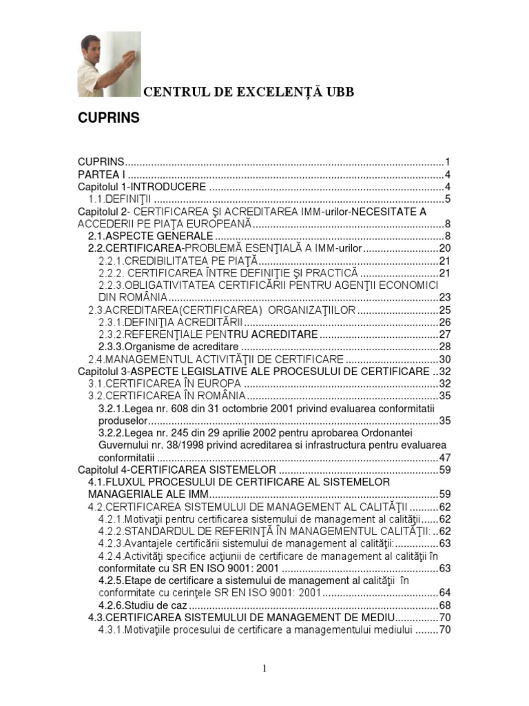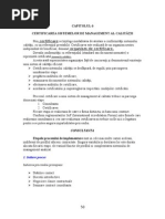 CUPRINS .............................................................................................................. 1 PARTEA I ............................................................................................................. 4 Capitolul 1-INTRODUCERE ................................................................................. 4 [Link] .................................................................................................... 5 Capitolul 2- CERTIFICAREA I ACREDITAREA IMM-urilor-NECESITATE A ACCEDERII PE PIAA EUROPEAN .................................................................. 8 [Link] GENERALE ............................................................................... 8 [Link]-PROBLEM ESENIAL A IMM-urilor .......................... 20 [Link] PE PIA.............................................................. 21 2.2.2. CERTIFICAREA NTRE DEFINIIE I PRACTIC ........................... 21 [Link] CERTIFICRII PENTRU AGENII ECONOMICI DIN ROMNIA ............................................................................................. 23 [Link](CERTIFICAREA) ORGANIZAIILOR ............................ 25 [Link] ACREDITRII ................................................................... 26 [Link] PENTRU ACREDITARE ......................................... 27 [Link] de acreditare .................................................................... 28 [Link] ACTIVITII DE CERTIFICARE ................................ 30 Capitolul 3-ASPECTE LEGISLATIVE ALE PROCESULUI DE CERTIFICARE .. 32 [Link] N EUROPA ................................................................... 32 [Link] N ROMNIA .................................................................. 35 [Link] nr. 608 din 31 octombrie 2001 privind evaluarea conformitatii produselor .................................................................................................... 35 [Link] nr. 245 din 29 aprilie 2002 pentru aprobarea Ordonantei Guvernului nr. 38/1998 privind acreditarea si infrastructura pentru evaluarea conformitatii ................................................................................................. 47 Capitolul 4-CERTIFICAREA SISTEMELOR ....................................................... 59 [Link] PROCESULUI DE CERTIFICARE AL SISTEMELOR MANAGERIALE ALE IMM ............................................................................... 59 [Link] SISTEMULUI DE MANAGEMENT AL CALITII .......... 62 [Link] pentru certificarea sistemului de management al calitii ...... 62 [Link] DE REFERIN N MANAGEMENTUL CALITII: .. 62 [Link] certificrii sistemului de management al calitii: ............... 63 [Link] specifice aciunii de certificare de management al calitii n conformitate cu SR EN ISO 9001: 2001 ...................................................... 63 [Link] de certificare a sistemului de management al calitii n conformitate cu cerinele SR EN ISO 9001: 2001 ........................................ 64 [Link] de caz ...................................................................................... 68 [Link] SISTEMULUI DE MANAGEMENT DE MEDIU............... 70 [Link] procesului de certificare a managementului mediului ........ 70