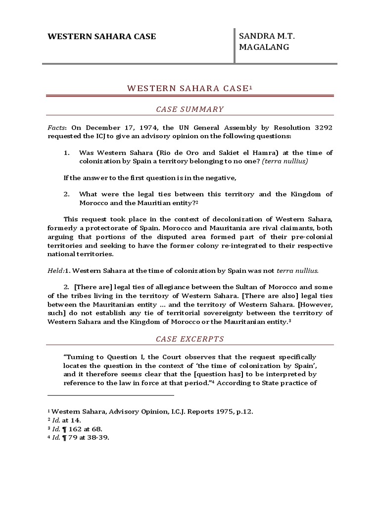 Id. 131 at 57. I.C.J., Summary of the Advisory Opinion of 16 October 1975, available at http://www.icj-cij.org/docket/index.php?sum=323&code=sa&p1=3&p2=4&case= 61&k=69&p3=5. 19 Western Sahara, Advisory Opinion, I.C.J. Reports 1975, 136 at 59. 20 See id. 138 at 60. 21 Id. 139 at 60.