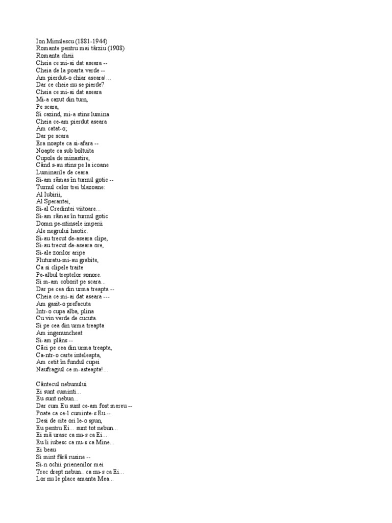 Mie nu-mi place amanta -or""" )i vad cu ochii tuturor 3emeia""" )u n-o pot vedea #ect cu-ai mei -manta Mea""" #ar cum din )i toti numai )u +u sunt ca )i% m s. m. duc #e voia mea la ,alamuc -'i *iindca nu-mi va parea r.u% Cumintele voi *i tot )u!""" 4delet. In cinstea ta% Cea mai *rumoasa si mai ne,una dintre *ete% 5oi scri trei ode% 1rei romante% 1rei ele0ii 'i trei sonete" 'i-n cinstea ta% Cea mai cantata din cate-n lume-au *ost cantate% #in *iecare vers voi *ace Cate-un ,reloc de-ar0int% /n care 6andirile-mi vor sta [Link]% ca niste pietre nestimate #e-a pururi incrustate-n ,ronzul 7nei coroane princiare! """ #in tara-n care dorm de veacuri vestitii 3araoni% #in tara In care '*incsii stau de vor,a cu +ilul s*ant 'i cu 'ahara% #in tara-n care palmierii 5estesc ara,ilor *urtuna 'i caravanelor pierdute Ca nu se mai /ntorc nici una% #in tara asta minunata 1acuta% 1rista 'i ,izara% Iti voi aduce trei smaralde nemaivazute-n alta tara% 1rei perle ,londe% pescuite de +e0ri-n 0ol*ul de den% 'i trei ru,ine-nsan0erate% ascunse toate-ntr-un re*ren #e 1riolet% &e care nimeni nu-l va intele0e% - *iindca nu-i In lume nimeni s.-ntelea0a sim,olul 1rioletului! """ Romanta *.r. muzic. Ca ne iu,im - si-o stie lumea toata )-adevarat( #ar cat ne vom iu,i +ici noi nu stim% +ici lumea nu va sti """ 'i nu va sti-o% poate% niciodata """ """"""""""""""""""""""""""""""" +e-am cunoscut /n tara-n care-alt8data Manon -escaut iu,i pe #es 6rieu9% Intr-un amur0 de toamna% orchestrate In violet% In al,% In roz 'i-n ,leu"