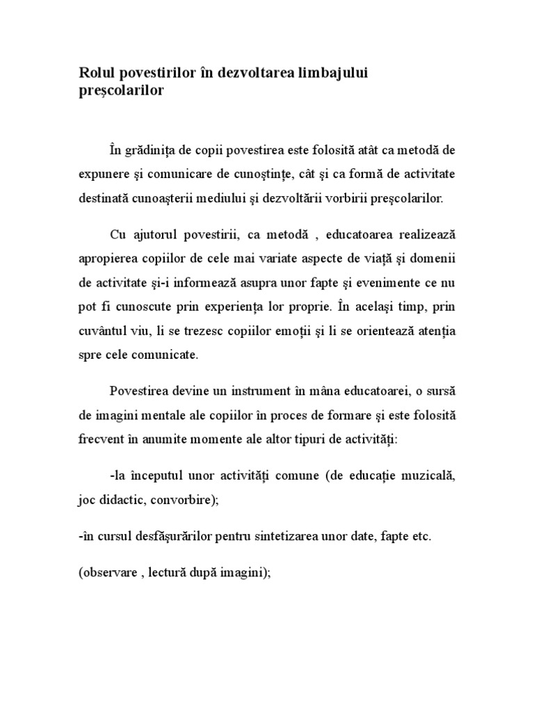 Povestirea devine un instrument în mâna educatoarei, o sursă