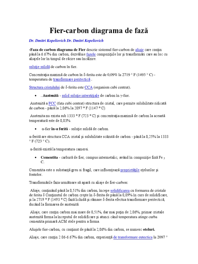 Dr. Dmitri Kopeliovich Dr. Dmitri Kopeliovich -Faza de carbon diagrama de Fier descrie sistemul fier-carbon de aliaje care conin pn la 6.67% din carbon, dezvluie fazele compoziiile lor i transformri care au loc cu aliajele lor n timpul de rcire sau nclzire. soluie solid de carbon n fier. Concentraia maxim de carbon n -ferita este de 0,09% la 2719 F (1493 C) temperatura de transformare peritectic . Structura cristalului de -ferita este CCA (organism cubi centrat). . Austenit - solid soluie interstiiale de carbon n -fier.