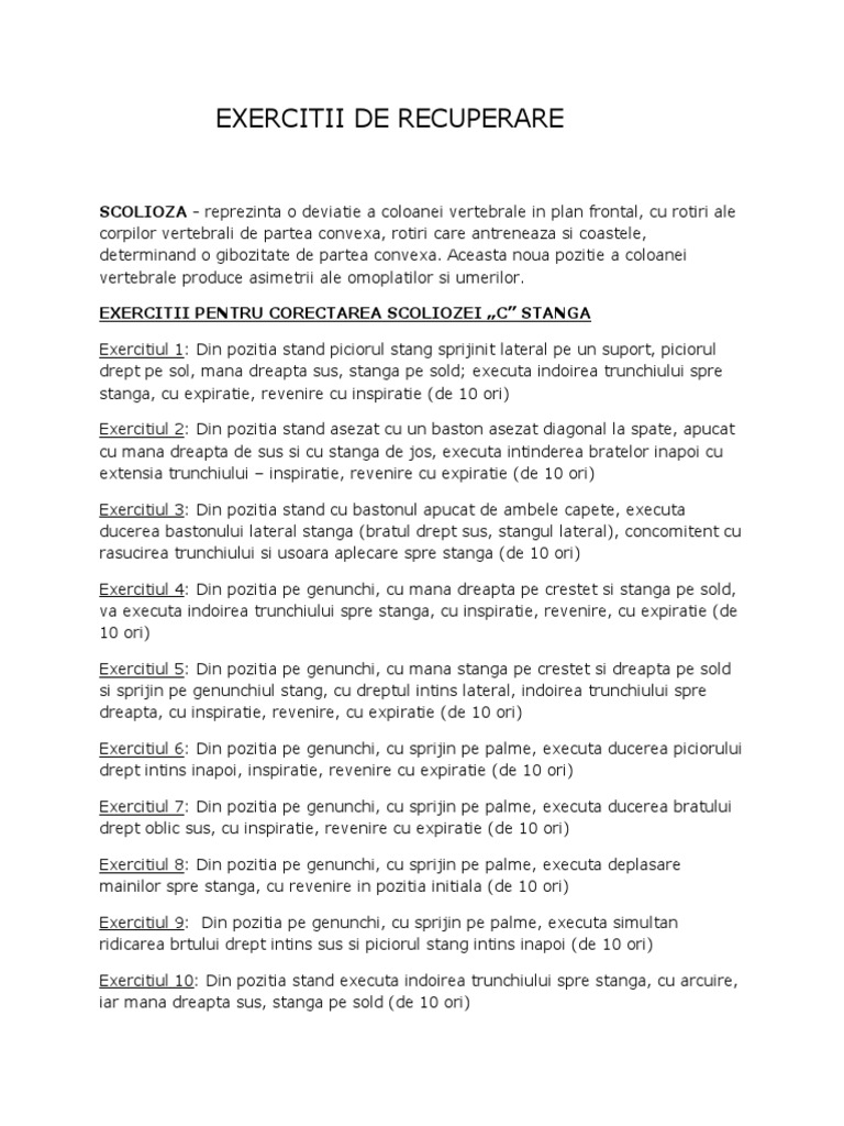 SCOLIOZA - reprezinta o deviatie a coloanei vertebrale in plan frontal, cu rotiri ale corpilor vertebrali de partea convexa, rotiri care antreneaza si coastele, determinand o gibozitate de partea convexa. Aceasta noua pozitie a coloanei vertebrale produce asimetrii ale omoplatilor si umerilor. EXERCITII PENTRU CORECTAREA SCOLIOZEI C STANGA Exercitiul 1: Din pozitia stand piciorul stang sprijinit lateral pe un suport, piciorul drept pe sol, mana dreapta sus, stanga pe sold; executa indoirea trunchiului spre stanga, cu expiratie, revenire cu inspiratie (de 10 ori) Exercitiul 2: Din pozitia stand asezat cu un baston asezat diagonal la spate, apucat cu mana dreapta de sus si cu stanga de jos, executa intinderea bratelor inapoi cu extensia trunchiului inspiratie, revenire cu expiratie (de 10 ori) Exercitiul 3: Din pozitia stand cu bastonul apucat de ambele capete, executa ducerea bastonului lateral stanga (bratul drept sus, stangul lateral), concomitent cu rasucirea trunchiului si usoara aplecare spre stanga (de 10 ori) Exercitiul 4: Din pozitia pe genunchi, cu mana dreapta pe crestet si stanga pe sold, va executa indoirea trunchiului spre stanga, cu inspiratie, revenire, cu expiratie (de 10 ori) Exercitiul 5: Din pozitia pe genunchi, cu mana stanga pe crestet si dreapta pe sold si sprijin pe genunchiul stang, cu dreptul intins lateral, indoirea trunchiului spre dreapta, cu inspiratie, revenire, cu expiratie (de 10 ori) Exercitiul 6: Din pozitia pe genunchi, cu sprijin pe palme, executa ducerea piciorului drept intins inapoi, inspiratie, revenire cu expiratie (de 10 ori) Exercitiul 7: Din pozitia pe genunchi, cu sprijin pe palme, executa ducerea bratului drept oblic sus, cu inspiratie, revenire cu expiratie (de 10 ori) Exercitiul 8: Din pozitia pe genunchi, cu sprijin pe palme, executa deplasare mainilor spre stanga, cu revenire in pozitia initiala (de 10 ori) Exercitiul 9: Din pozitia pe genunchi, cu sprijin pe palme, executa simultan ridicarea brtului drept intins sus si piciorul stang intins inapoi (de 10 ori) Exercitiul 10: Din pozitia stand executa indoirea trunchiului spre stanga, cu arcuire, iar mana dreapta sus, stanga pe sold (de 10 ori)
