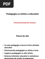 fiind rezultatul mbinrii cuvintelor : pais - copil i agoge - conducere, educaie, precum i a cuvintelor paideea - nvmnt, educaie i paidagogos - ndrumtor de copii, pedagog. Pedagogia este tiina care studiaz fenomenul educaional. Ea se ocup deci de formarea personalitii umane n vederea integrrii ei active, creatoare n viaa social. n dicionarele i n lucrrile de specialitate pedagogia este definit ca tiin, ca art, ca un ansamblu de teorii care asigur fundamentarea unei concepii despre dirijarea logic a activitii de educaie, (Coudray, Leandre, Lexique de sciences de leducation, 1973, p. 125) sau ca tiina i arta de a instrui i a forma individualiti umane permind fiecruia realizarea sa ca personalitate i ca inteligen (Dictionaire de la philosofie, Larousse, Paris, 1995, p. 208). 1.2. Constituirea pedagogiei ca tiin. Apariia unei tiine se realizeaz printr-un proces complex i ndelungat. Pedagogia reprezint i ea rezultatul unui proces complex care din punct de vedere istoric cuprinde dou etape mari: etapa reflectrii educaiei n contiina comun a oamenilor; etapa reflectrii teoretice a fenomenului educaional. Educaia ca fenomen social a aprut odat cu societatea. Mult vreme acest fenomen se reflecta n contiina oamenilor sub forma de reprezentri i idei izolate, ocazionale, constituite n procesul activitii practice. Preocupri teoretice speciale pentru studiul fenomenului educaional au aprut odat cu diferenierea dintre munca fizic i cea intelectual. Primele sisteme teoretice care aveau menirea s ofere o explicaie mai cuprinztoare asupra acestui fenomen i s orienteze activitatea educativ practic au fost elaborate n cadrul diferitelor sisteme filozofice. Marii filosofi ai antichitii au fost i teoreticieni ai fenomenului educaional. Ulterior, teoretizarea fenomenului, educaional devine o preocupare a unor mari personaliti ca Ian Amos Comenius (1592-1670); J. J. Rousseau (1712-1778); Johann Henrich Pestalozzi (1746-1827); Johann Friedrich Herbart (1776-1841); K. D. Usinki (1824-1870) etc. Aceasta activitate este concretizat n elaborarea mai multor sisteme pedagogice. La sfritul secolului al XIXlea i nceputul secolului al XXlea ca urmare a rezultatelor obinute de ctre sociologie i psihologie, pedagogia cunoate un nou salt n evoluia ei. n cadrul ei se constituie diverse curente de orientare predominant sociologic sau predominant psihologic, care concep educaia n mod unilateral i genereaz o opoziie ireductibil ntre social i psihologic n structura educaiei. Contradicia aceasta devine antinomic ntruct a cultiva socialul fr un suport psihologic nseamn a avea doar caliti ale personalitii independent de purttorul lor, dup cum a cultiva doar individul nseamn a pierde din vedere finalitatea educaiei, integrarea n societate (8, pag. 22). n a doua jumtate a secolului al XX-lea i mai ales n zilele noastre se impune cu tot mai mult insisten concepia interdisciplinar n abordarea
