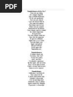 Unu Unu este un crlig, Cu nas ngheat de frig. Unu-i soarele pe cer, Una-i luna cu mister. Doi Doi este un le !doi Ce noat! pe "!voi, Dou! mini, dou! picioare, Doi ochi are fiecare. 2 Doi e o pereche istea!, Doi p!rini ce ne-au dat via!. Unde-s doi puterea cre#te, $armecul vieii spore#te. Trei %rei este ca un cocor Care se nal!-n " or, %rei e-o inim! deschis!