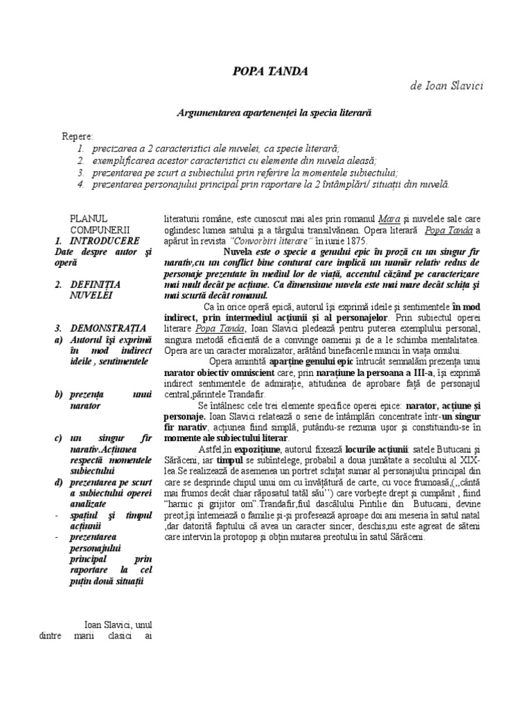 mai +un# $ Desf urarea aciunii surprinde %ncerc#rile acestuia de a-i convin"e pe s#teni s# se apuce de munc# , adres ndu-le mai %nt i vor+e +l nde , s-aturi $ apoi vor+e ironice si amenin/#ri$ Nu reu!e!te nimic pe aceast# cale !i, anali, nd cu luciditate situa/ia, %!i da seama c#, pentru a ie!i el %nsu!i din s#r#cie, tre+uie s# se concentre,e asupra universului casnic $ Prin e-orturi mari preotul !i so/ia sa reu!esc s# %!i trans-orme "ospod#ria d#r#p#nat# %ntr-un spa/iu al prosperit#/ii, repar ndu-!i casa, cultiv ndu-!i p#m ntul !i c !ti" nd +ani din v n,area leselor$ 9e+rilitatea muncii !i satis-ac/ia re,ultatelor aduc %n punctul culminant +ucurii nesperate -amiliei preotului,pre"#tite cu lucruri noi pentru ,iua de Rusalii$ Deznod m!ntul pre,int# ima"inea de nerecunoscut a satului S#r#ceni, deoarece s#tenii au urmat e*emplul preotului !i s-au [Link]+at$ Popa 1anda, considerat acum de s#teni 7omul lui :umne,eu8,+#tr n -iind, apare %ncon0urat de dra"ostea -amiliei lui numeroase$ Ca %n orice nuvel# , e*ist# !i aici un conflict concentrat , des-#!urat at t %n plan e*terior c t !i %n plan interior$ Cel e*terior se mani-est# %ntre preot !i poporeni !i se ampli-ic# pe parcurs , iar cel su-letesc apare din dorin/a preotului de a-i [Link]+a pe s#teni $ O alta caracteristic# a nuvelei este num rul redus de personaje : persona0ul principal , p#rintele 1randa-ir , numit de s#teni Popa 1anda , omonim cu titlul nuvelei , persona0e secundare 4 preoteasa , vecinul Marcu 9lorii Cucului6 sau episodice 4copiii, Co,onac !i s#tenii6$ "ccentul cade pe caracterizarea personajului principal pre,entat %n toat# comple*itatea lui %n mediul s#u de via/# $ ;nt mpl#rile la care ia parte sunt un prete*t pentru a-i de,v#lui personalitatea $ Persona0ul este pre,entat %n evolu/ia sa , ac/iunea derul ndu-se pe parcursul mai multor ani : -iu al dasc#lului Pintilie , preot %n satul natal , apoi %n S#r#ceni !i ima"inea -inal# care %l pre,int# a0uns la v rsta +#tr ne/ii %n mi0locul celor dra"i al#turi de care se +ucur# de armonia -amilial# , p#str ndu-se 7vesel ,verde !i .arnic 7 Popa 1anda este sim+olul misionarului care reu!e!te s# trans-orme comunitatea datorit# -irii ener"ice , dinamice !i %ntreprin,#toare $ E*ponent al oamenilor simpli, %!i "#se!te alinarea %n momentele de restri!te %n credin/a -a/# de :umne,eu$ Este antipati,at datorit# -irii [Link] , prea directe , dar pe parcusul anilor se inte"rea,# !i c !ti"# simpatia s#tenilor care nu-l mai consider# ,,omul dracului55, ci 7omul lui :umne,eu8$ #itlul nuvelei este alc#tuit din su+stantivul 7popa8 !i su+stantivul propriu 71anda8 , derivat de la ver+ul 7a t nd#li8 ce su"erea,# %ncerc#rile p#rintelui de a-i %ndrepta pe s#teni um+l nd din cas# %n cas# $ $odul de expunere predominant este naraiunea , relatarea -aptelor se -ace la persoana a III-a , %ntr-un mod o+iectiv$ Oralitatea stilului d# scrierii un caracter spontan, viu$ Nara/iunea se %m+in# armonios cu dialo"ul, monolo"ul interior !i descrierea , pres#rate cu pu/ine -i"uri de stil : inversiuni 48+un om era parintele 1randa-ir86,epitete !i enumera/ii4 8vesel,verde !i .arnic86$ Cunosc nd de-ini/ia nuvelei !i av nd %n vedere -aptul c# opera literar# %opa &anda de Ioan Slavici este o oper# epic# cu un sin"ur -ir narativ, %n care accentul cade pe pre,entarea comple*# a persona0ului, putem conclu,iona c# opera aminitit# apar/ine acestei specii literare$