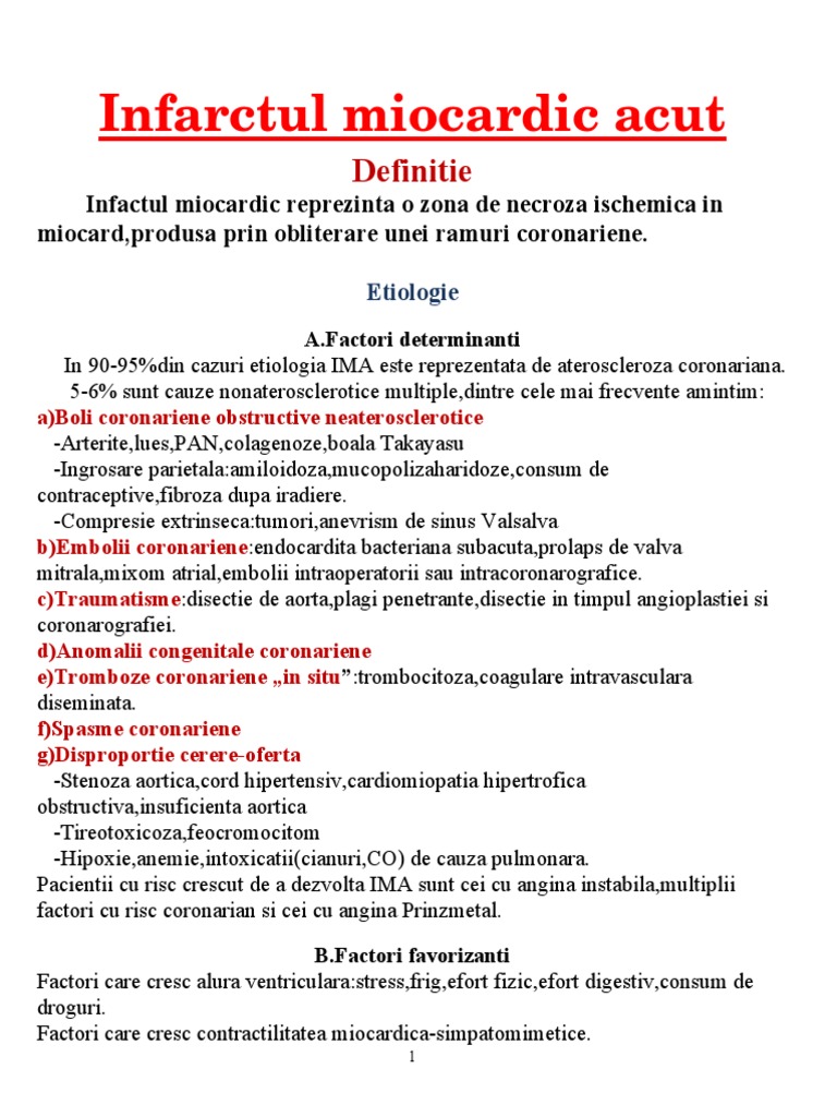 [Link] determinanti In 90-95%din cazuri etiologia IMA este reprezentata de ateroscleroza coronariana. 5-6% sunt cauze nonaterosclerotice multiple,dintre cele mai frecvente amintim: a)Boli coronariene obstructive neaterosclerotice -Arterite,lues, A!,colagenoze,"oala #a$a%asu -Ingrosare parietala:amiloidoza,mucopoliza&aridoze,consum de contraceptive,fi"roza dupa iradiere. -'ompresie e(trinseca:tumori,anevrism de sinus )alsalva b)Embolii coronariene:endocardita "acteriana su"acuta,prolaps de valva mitrala,mi(om atrial,em"olii intraoperatorii sau intracoronarografice. c)Traumatisme:disectie de aorta,plagi penetrante,disectie in timpul angioplastiei si coronarografiei. d)Anomalii congenitale coronariene e)Tromboze coronariene in situ!:trom"ocitoza,coagulare intravasculara diseminata. f)"pasme coronariene g)Disproportie cerere#oferta -*tenoza aortica,cord &ipertensiv,cardiomiopatia &ipertrofica o"structiva,insuficienta aortica -#ireoto(icoza,feocromocitom -+ipo(ie,anemie,into(icatii,cianuri,'-. de cauza pulmonara. acientii cu risc crescut de a dezvolta IMA sunt cei cu angina insta"ila,multiplii factori cu risc coronarian si cei cu angina rinzmetal. [Link] favorizanti /actori care cresc alura ventriculara:stress,frig,efort fizic,efort digestiv,consum de droguri. /actori care cresc contractilitatea miocardica-simpatomimetice.